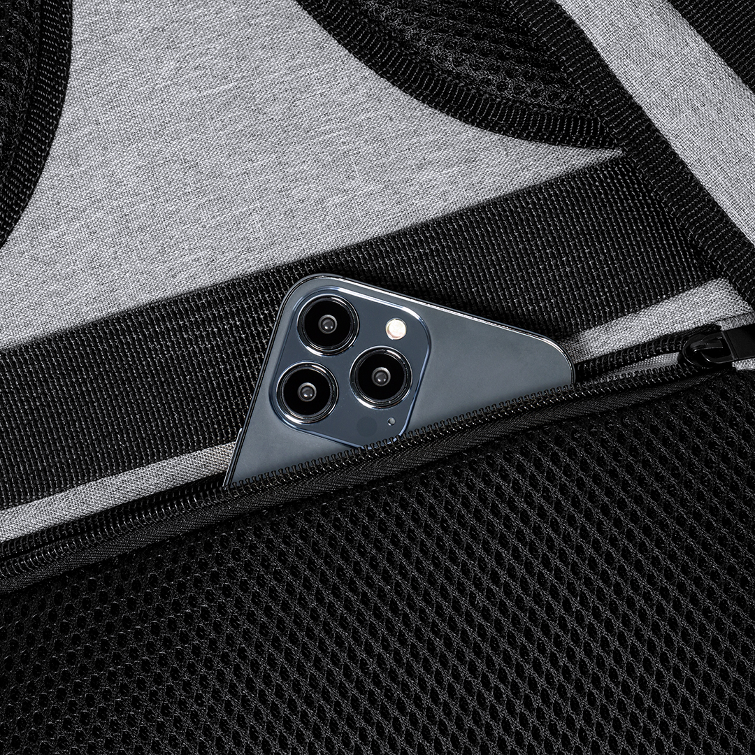 Multifunctional backpack made of 300D RPET. Made from recycled and water resistant polyester, with excellent breathability in the back area, facilitating heat dissipation thanks to its padded straps and padded back. The wide shoulder straps are designed to relieve pressure on the shoulders, enabling the backpack to be worn comfortably for long periods of time.Perfect for any situation, and with multiple compartments: 2 front pockets. 3 large central compartments, one of which is a large compartment, a large central pocket for storing clothes and/or accessories with an organiser inside, and a third padded pocket, perfect for carrying a laptop up to 17.3 inches. It also has 3 special compartments, a side pocket perfect for quick access, a shoe pocket on the bottom with ventilation eyelets, and an anti-theft pocket on the back, plus USB cable. Perfect for travel or everyday use with adjustable straps to suit all lifestyles. Available in black and grey, with RPET label included. Presented individually in a recycled bag.