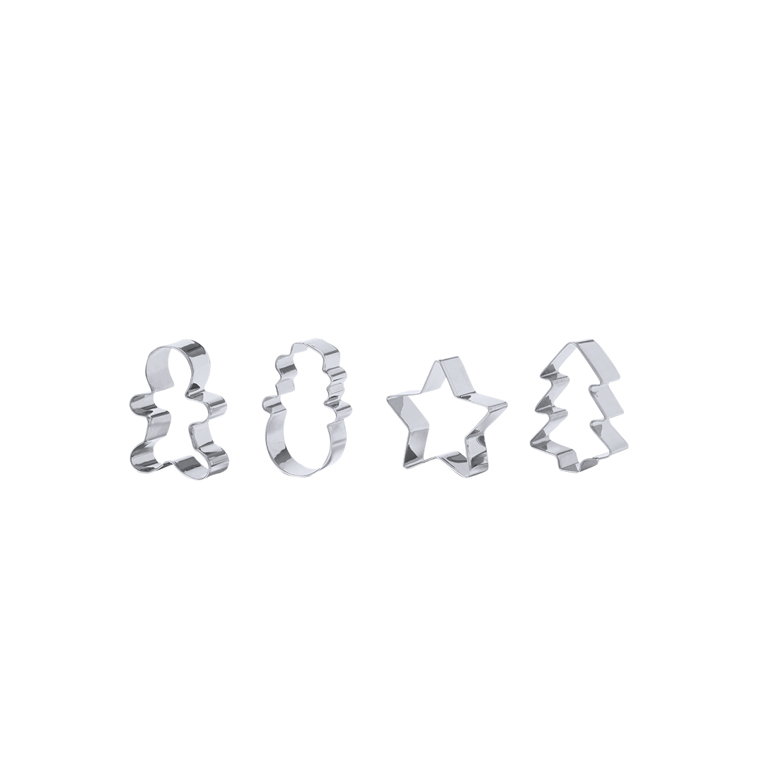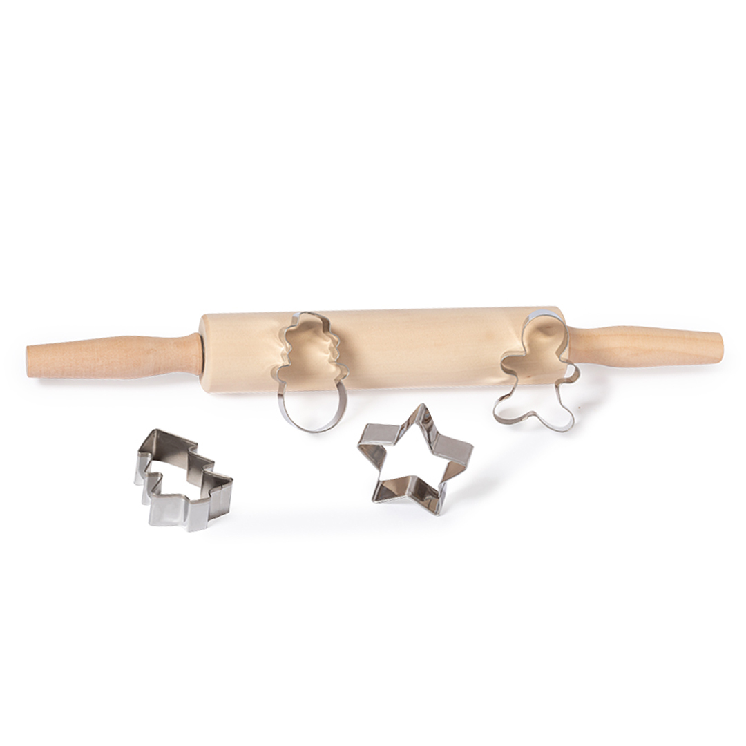 Christmas bakery set. Including molds made in stainless steel; and rolling pin made in resistant natural wood. Including rolling pin and 4 moulds in the shape of Christmas Tree, Star, Snowman and Gingerbread Man. Presented in a kraft box.