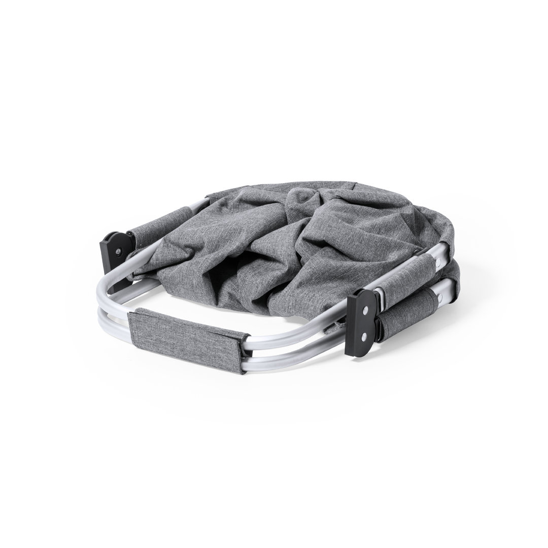 Foldable basket made of durable 600D RPET. With resistant aluminium frame and 2 foldable aluminium carrying handles, with matching velcro strap. Outside pocket with zip closure and outside label with the RPET distinctive.RPET material is made from recycled plastic, to encourage the reuse of plastic waste and help the sustainability of the planet.