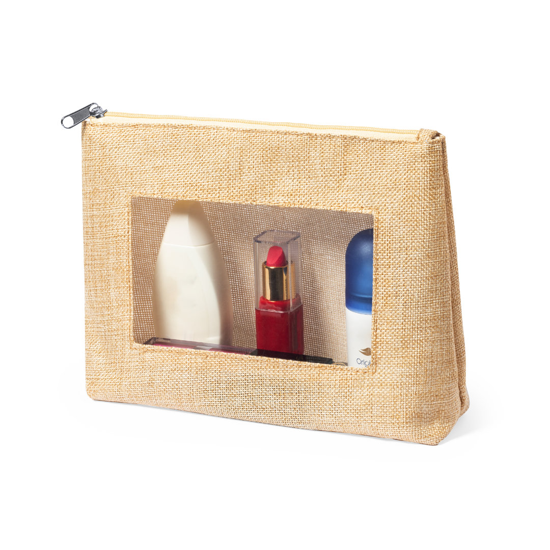 Beauty bag inspired by nature, with window on one side. With matching zip closure and stitching finish. Made of natural tone polyester, with transparent EVA window.