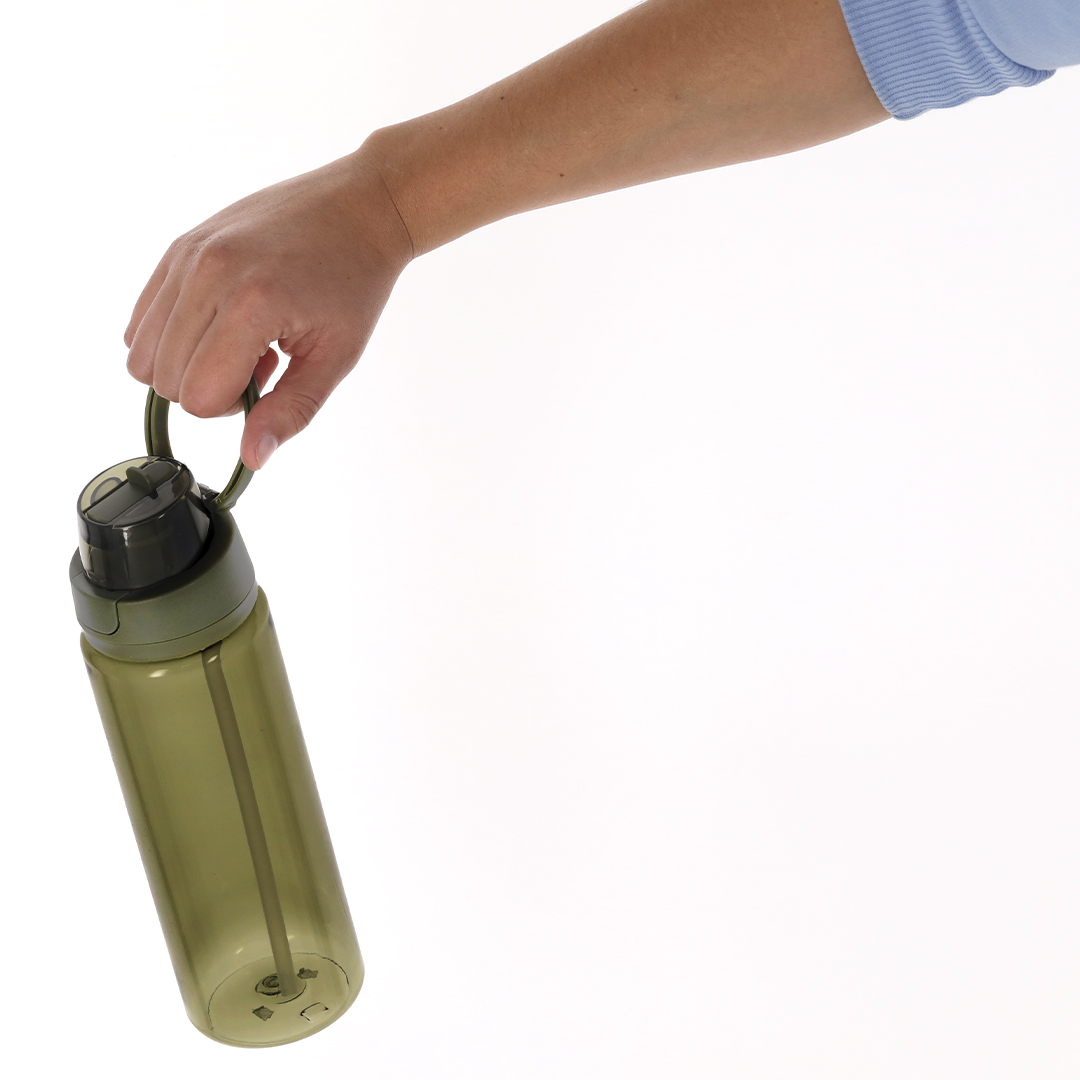 750ml capacity bottle, made of resistant RPET and in a translucent finish. With double drinking system, straw and drinking hole. Push closure lid and folding handle. BPA free.