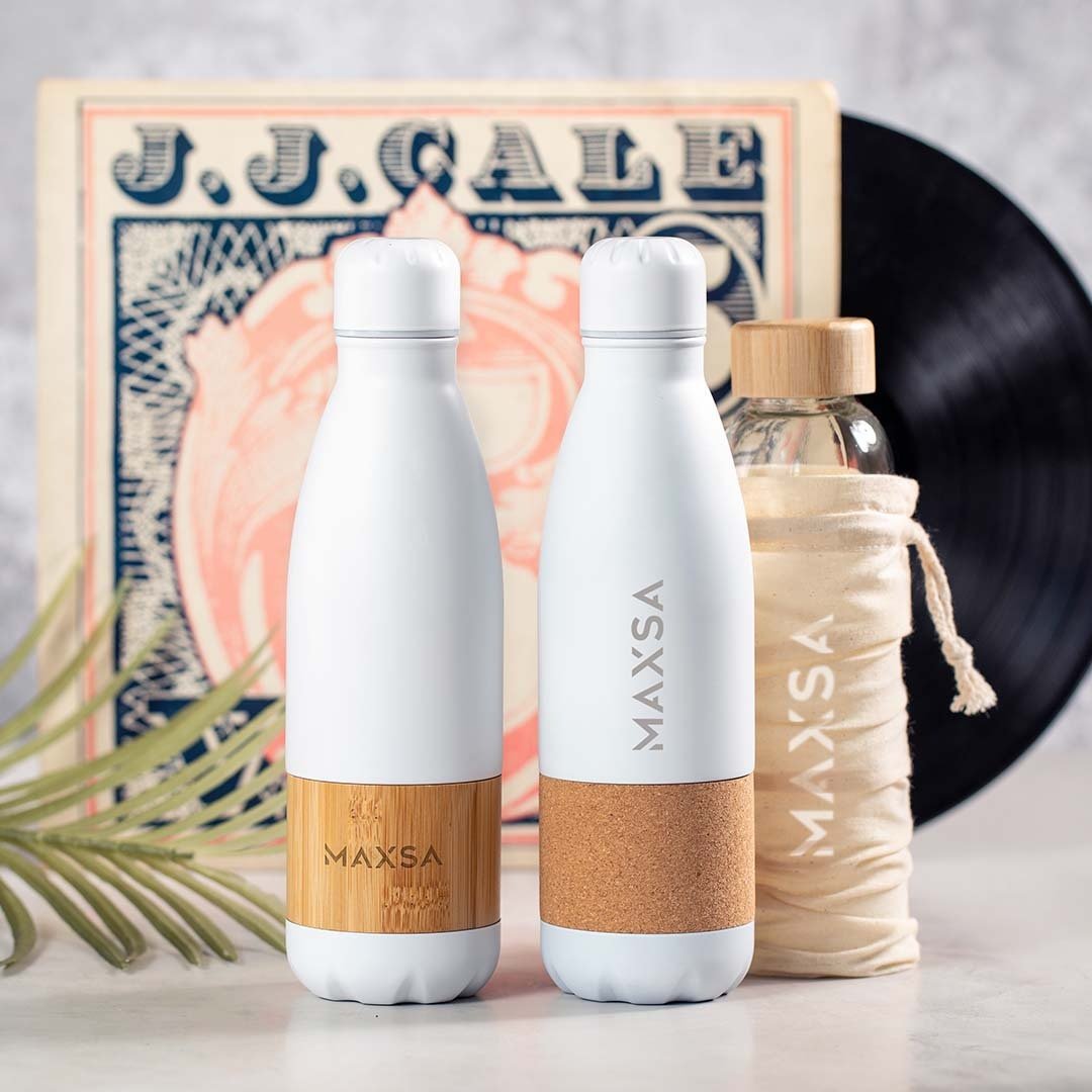 750ml, nature line bottle. Stainless steel body in white matt finish, with central band in natural cork. Safety screw cap in matching color and presented in an attractive eco design box.