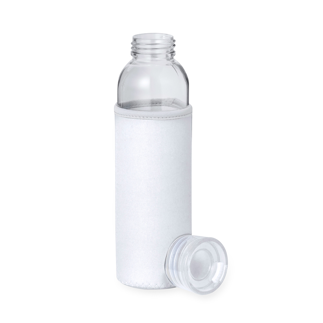 500 ml capacity bottle. Glass body with screw cap and practical silicone handle for easy carrying. Supplied with matching soft shell sleeve. Available in a wide range of colours and presented in an individual box with an attractive kraft design.