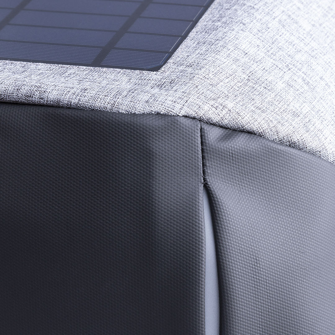 Backpack with integrated solar power panel in resistant 1200D polyester. Water repellent, with USB charging port -powerbank not included- and security lock with password. Main compartment with double puller. Inside padded pocket for notebooks up to 15 inches and tablets up to 10 inches size. Shoulder and back straps with ergonomic padding.