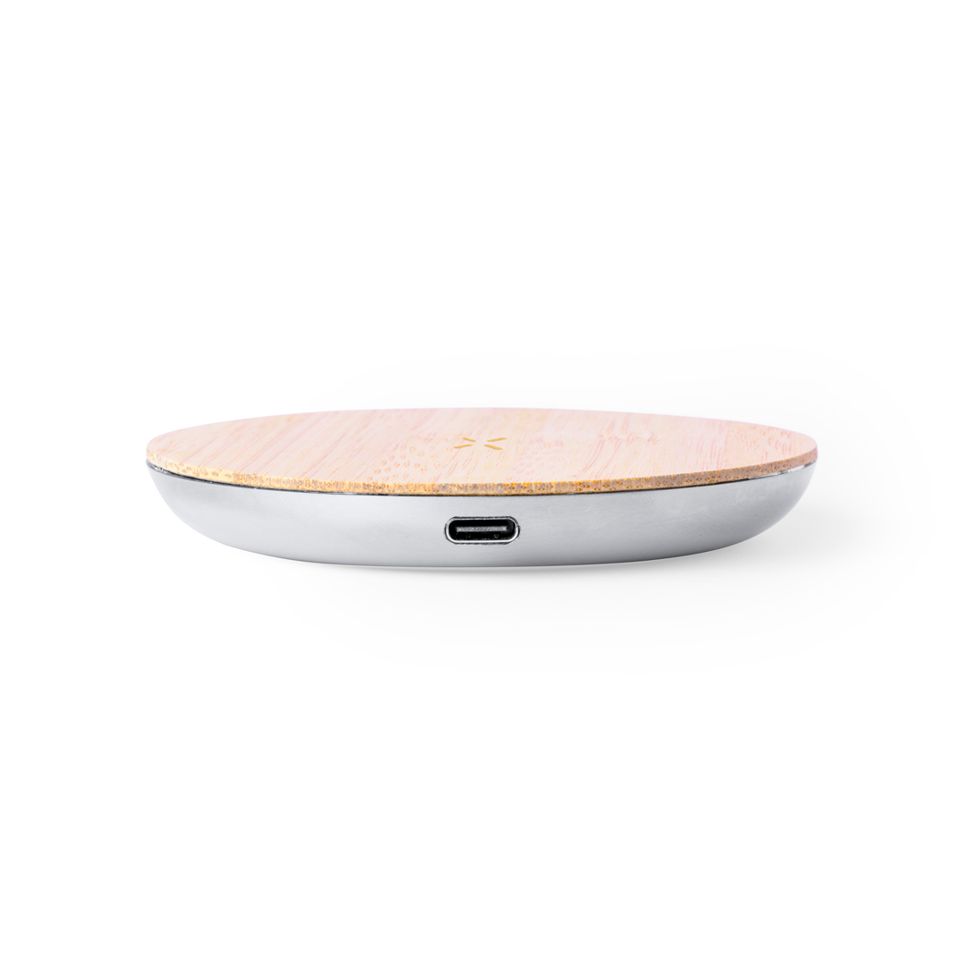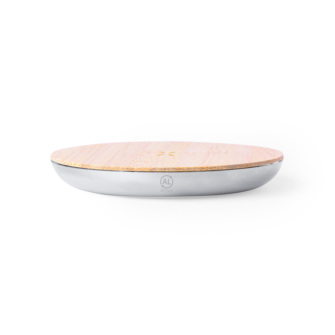 Wireless Charger 15W with circular design, body made of Recycled Aluminium and bamboo charging base. Compatible with devices equipped with Qi wireless charging technology, with Type C charging cable included and LED charging status indicator. Non-slip base and presented in an individual box of kraft design, with instruction manual in English and Spanish.Materials such as bamboo encourage the use of natural raw materials, reducing pollutant emissions. It comes from a highly resistant and versatile plant with rapid growth and regeneration, making of it an excellent alternative to traditional wood.Recycled Aluminium is a material with almost infinite recycling possibilities, keeping its original properties and consuming less energy during this process.GRS Certification (Global Recycled Standard), which guarantees the recycled origin of the material used to manufacture the product.Manufactured according to RoHS standards and in compliance with the following safety requirements: Overheating protection system. Over-charge protection system. Blocking system to prevent short circuits.