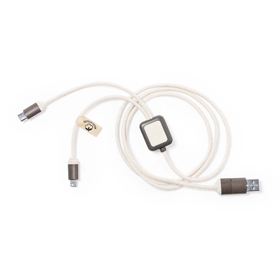 Charging cable made of coffee fibre, with cables covered in recycled cotton. Type C and USB input connections, with Type C, Lightning and Micro USB outputs. 5V DC 2.4A. With coffee fibre and recycled cotton logo. Presented in an individual kraft design self-seal bag.Coffee fibre is a circular solution that is obtained from the use of the waste produced in the production of coffee. A sustainable alternative that favours the reduction of the use of plastics, saving energy in its manufacturing process and contributing to the care of the environment. GRS (Global Recycled Standard) certification is available, which guarantees the recycled origin of the material used to manufacture the product.