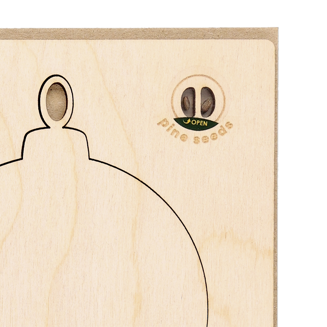 Sustainable and original Christmas card set with pine seeds, an environmentally friendly and surprising gift. Contents:Postcard made of Kraft paper. Christmas Ball made of natural wood with die-cut inside. Pine seed capsule integrated inside.Made with plant-based elements to promote the use of natural raw materials and reduce polluting emissions.