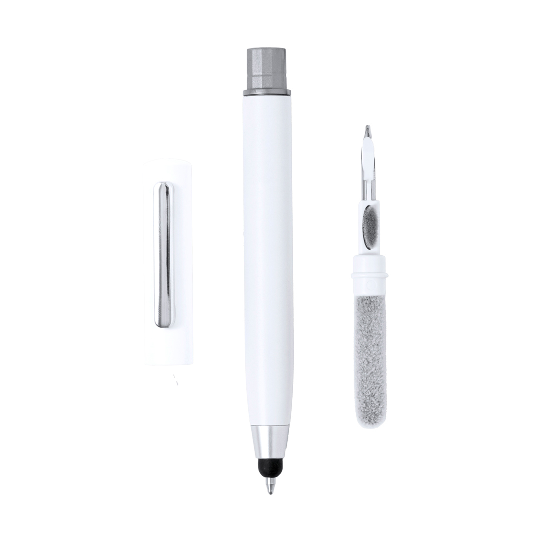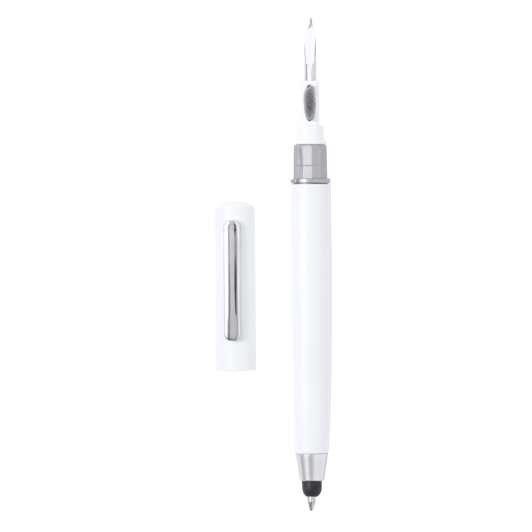 Handy ball pen with twist mechanism, and cleaning accessories housed at the top of the barrel. Includes a brush and metal tip protected by a hood. With metal clip and in blue ink. Available in various colours and presented individually in a kraft box.