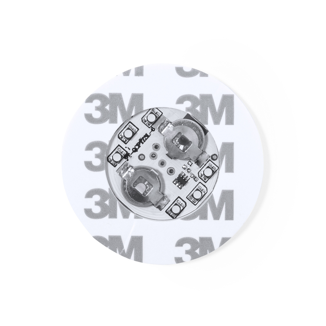 Original coaster with 6 LEDs for the illumination of drinks. With button on the base for different lighting positions: in fixed or mixed colours. It is attached to the base of any glass with an adhesive band and is powered by two button cells (included).