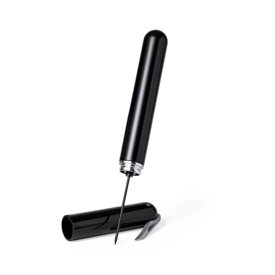 Corkscrew with integrated air pump for an easy and safe cork removal. Made in resistant ABS material, including a capsule cutter. Presented in an attractive design box.