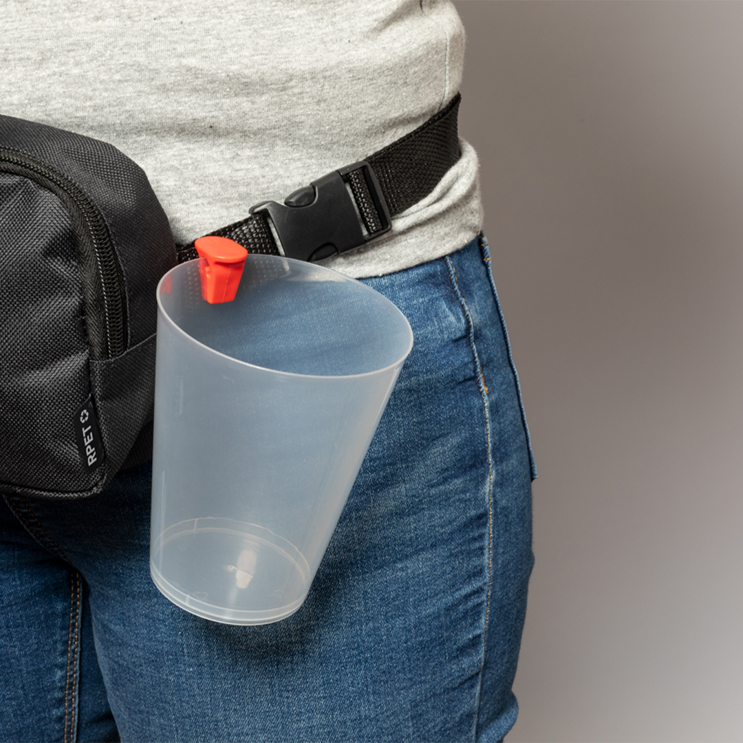 Practical cup holder clip made of resistant ABS. Easy to use and adaptable to any plastic plastic tumbler. With a special flat surface for customization. Available in a wide range of colours.