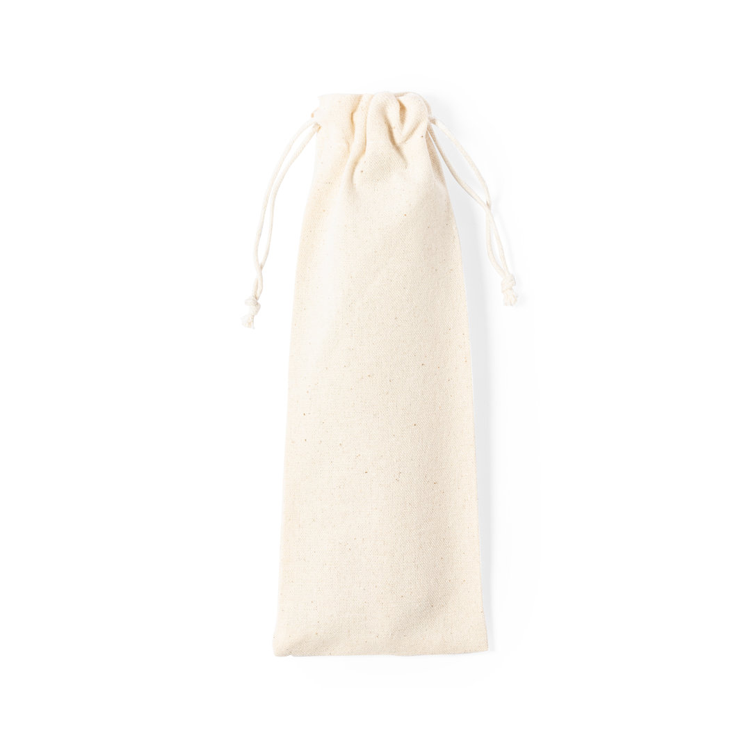 5-piece cutlery set made in stainless steel, with natural wood handle. Including spoon, fork, knife, reusable straw and cleaning brush for the straw. Presented in a natural cotton pouch with drawstring closure.