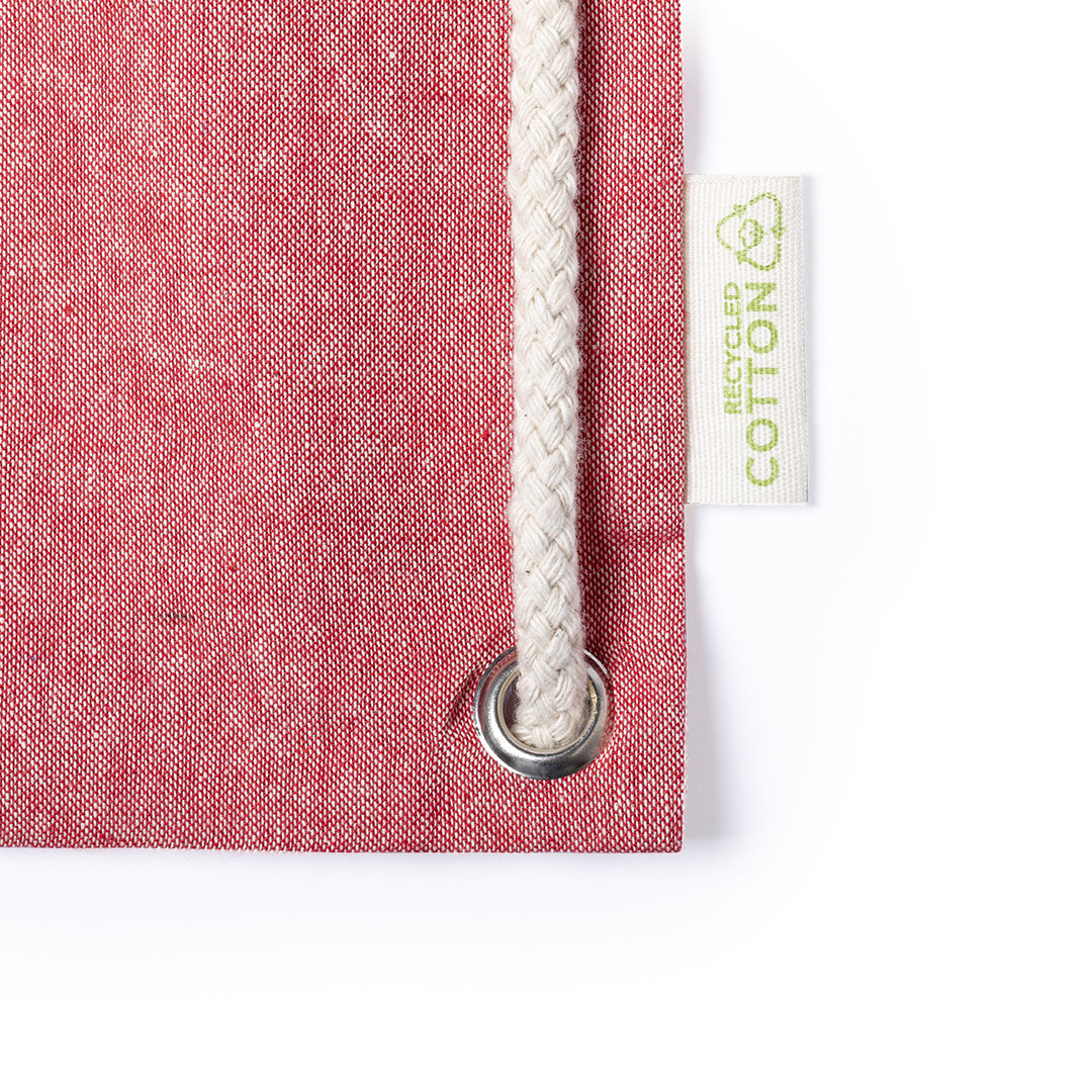 Nature line drawstring backpack bag in durable 140g/m2 recycled cotton, with matching 70 cm lenght carrying handles. Natural color cotton strings, with reinforced metal eyelets and recycled cotton label. Available in a wide range of colours. Resistance up to 9kg in weight.