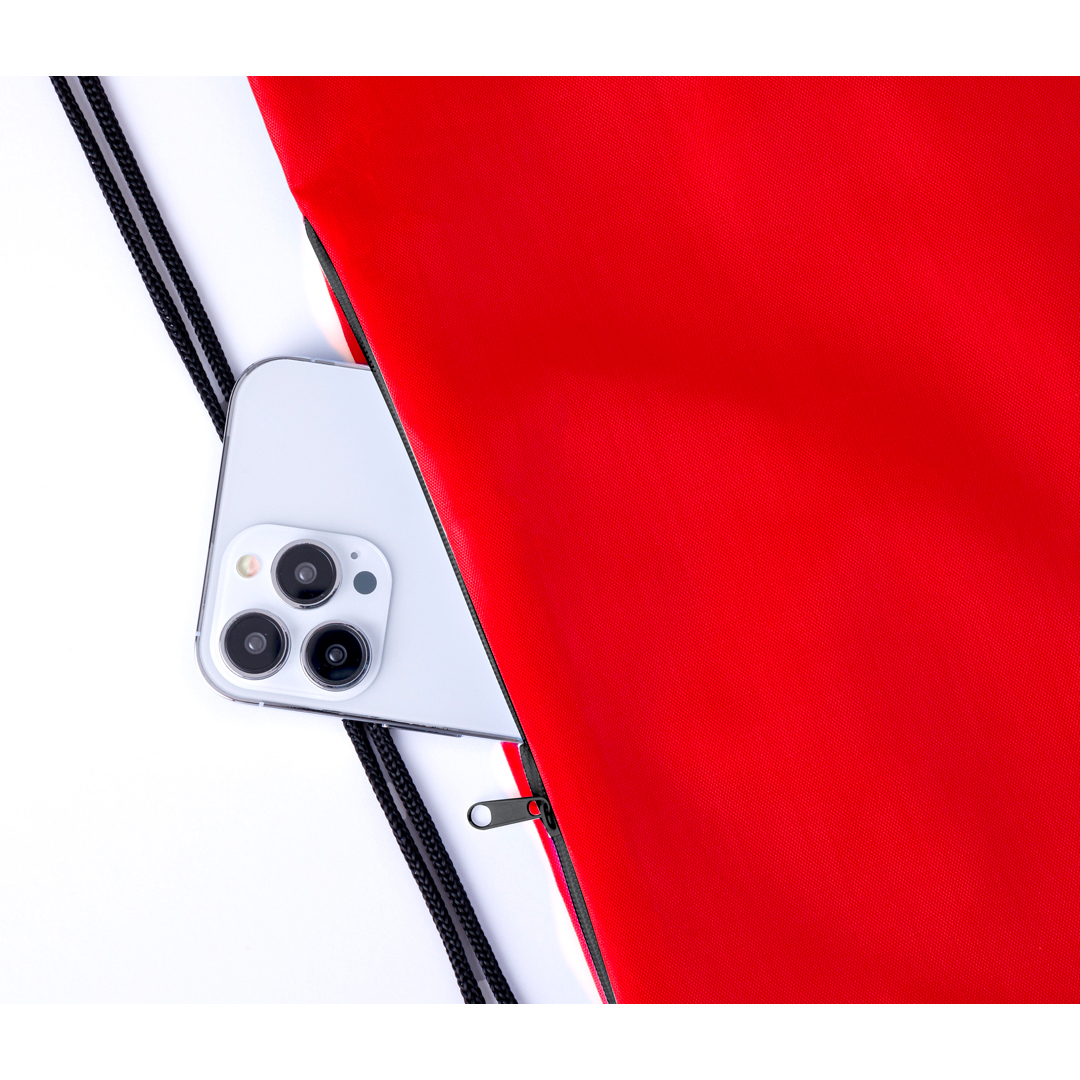Drawstring backpack made of soft 210T RPET polyester. With self-closing strings, and including a side zipped pocket. RPET side label and available in a variety of colours (white color specially made for sublimation printing).RPET material is made from recycled plastic, thus promoting the reuse of plastic waste and helping the sustainability of the planet.