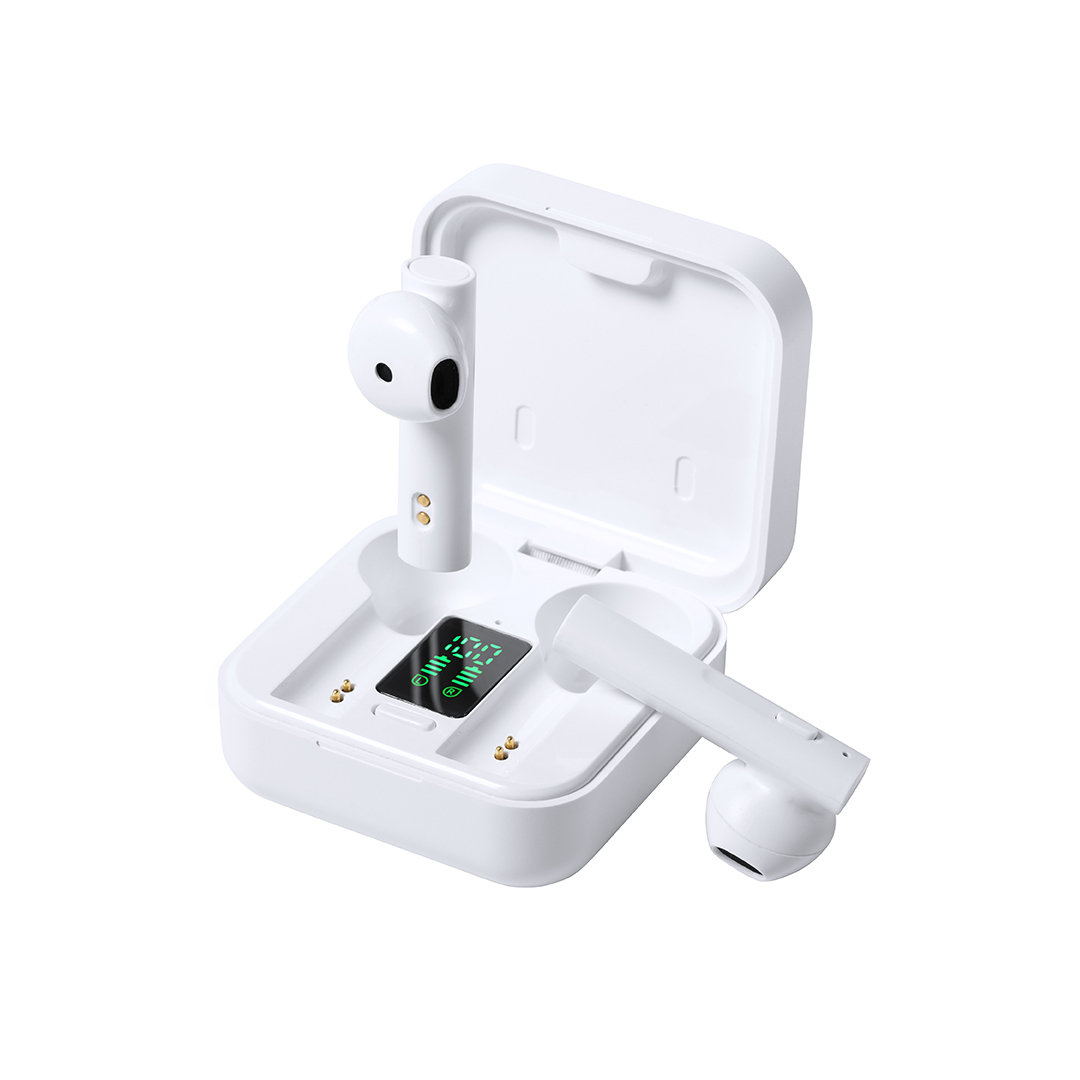 Earphones in stylish white finish with Bluetooth® 5.0 connection. Solar charging panel integrated in the lid and inside LCD display with charging status indicator. Ergonomically designed, with integrated control button on the earpiece and matching base. Hands-free function and rechargeable with solar power or via micro USB cable -included-. Presented in a premium, hinged-opening individual case and inside an attractive design box, with user manual in English and Spanish.