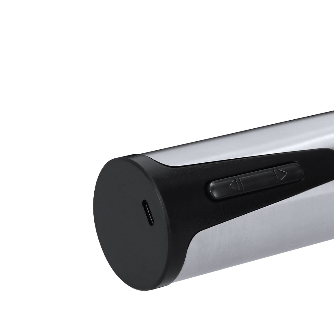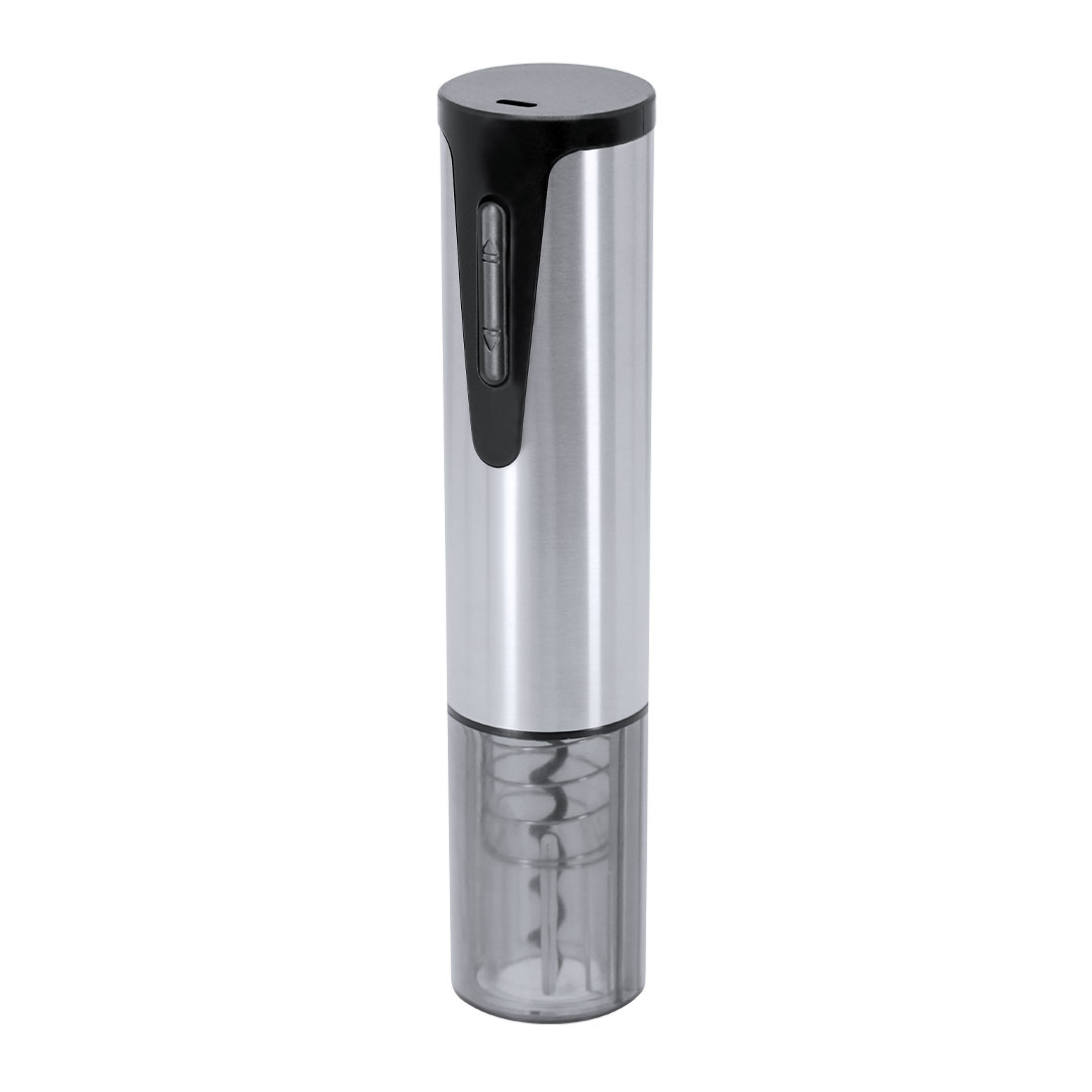 Electric corkscrew made of stainless steel and ABS. It has an extraction indicator button and cork ejector. With light indicators during charging and use. 500 mAh rechargeable battery, includes type C charging cable. An easy-to-use and functional device.