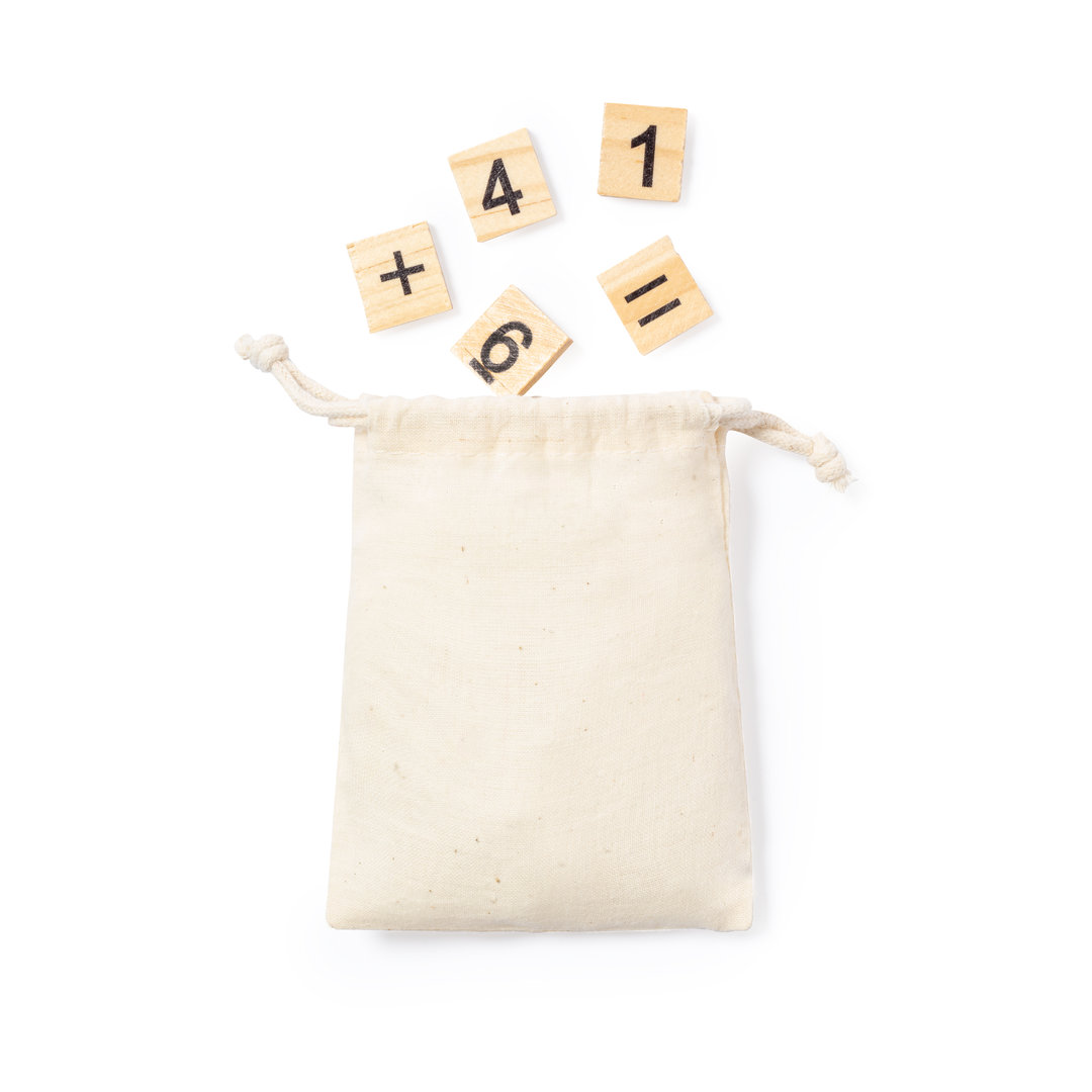 Calculation set made of resistant natural pine wood. Set of 32 pieces in a cotton carry bag with matching drawstrings.