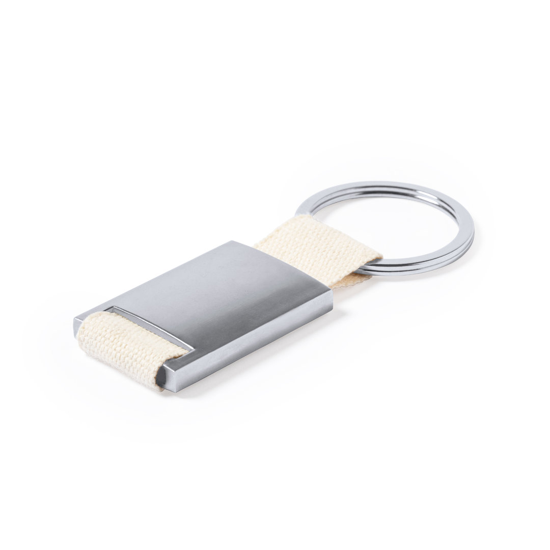 Keyring with silver finish metal body. cotton ribbon with natural finish, with wide branding surface and matching metal ring. Presented in an individual bag with kraft cardboard insert.
