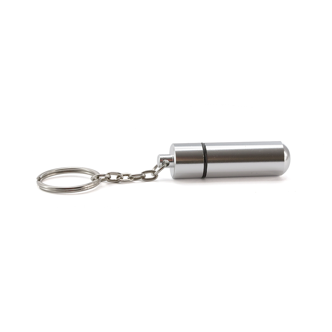 Discreetly designed pill case keychain with aluminum body, in glossy finish and with screw-on lock.