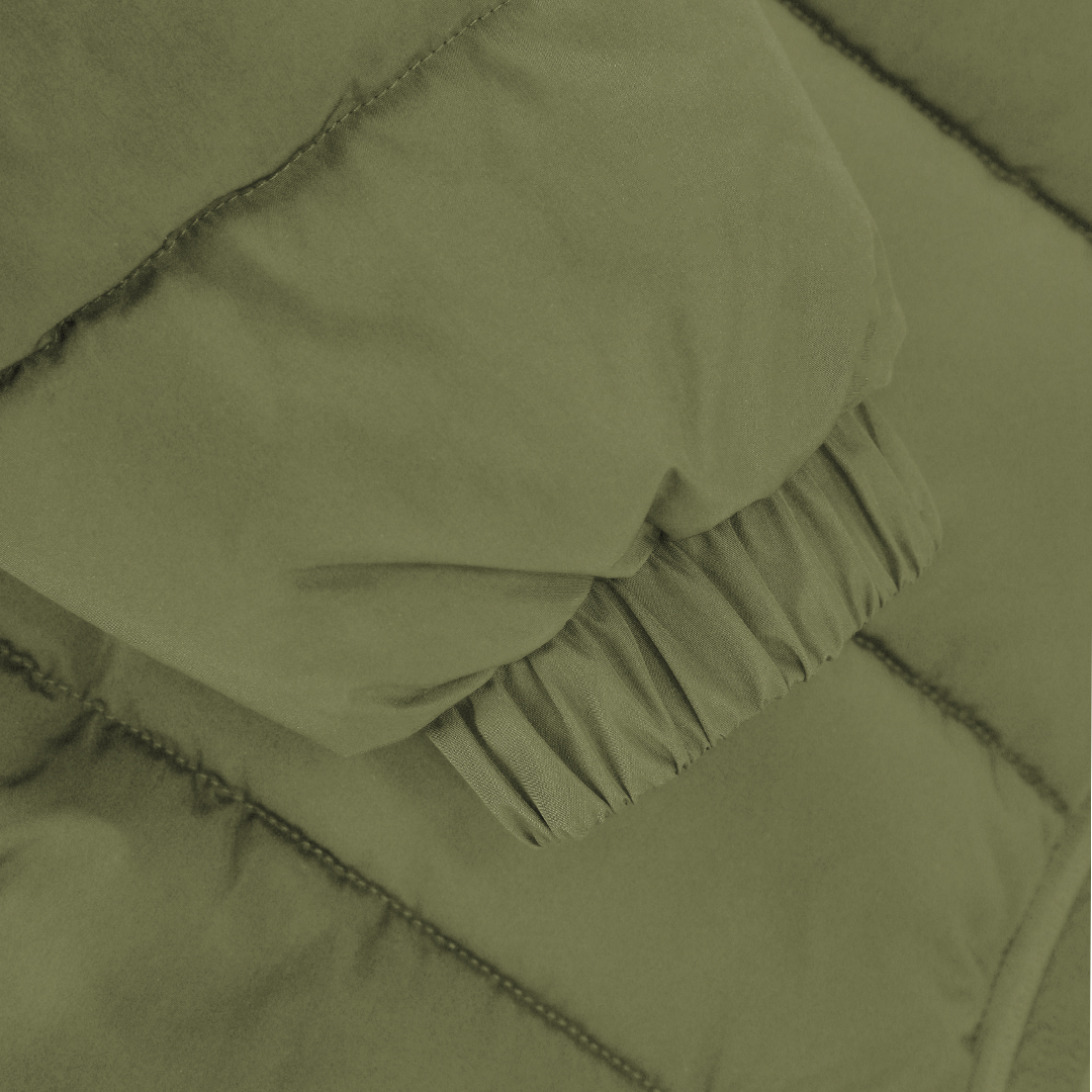 Childrens unisex padded parka with fixed hood and integrated visor. Features matching front zip with double puller and chin guard, elastic cuffs for a comfortable fit, and two side pockets with matching zip closure. Includes inner access for branding on left chest and back, ideal for customization.