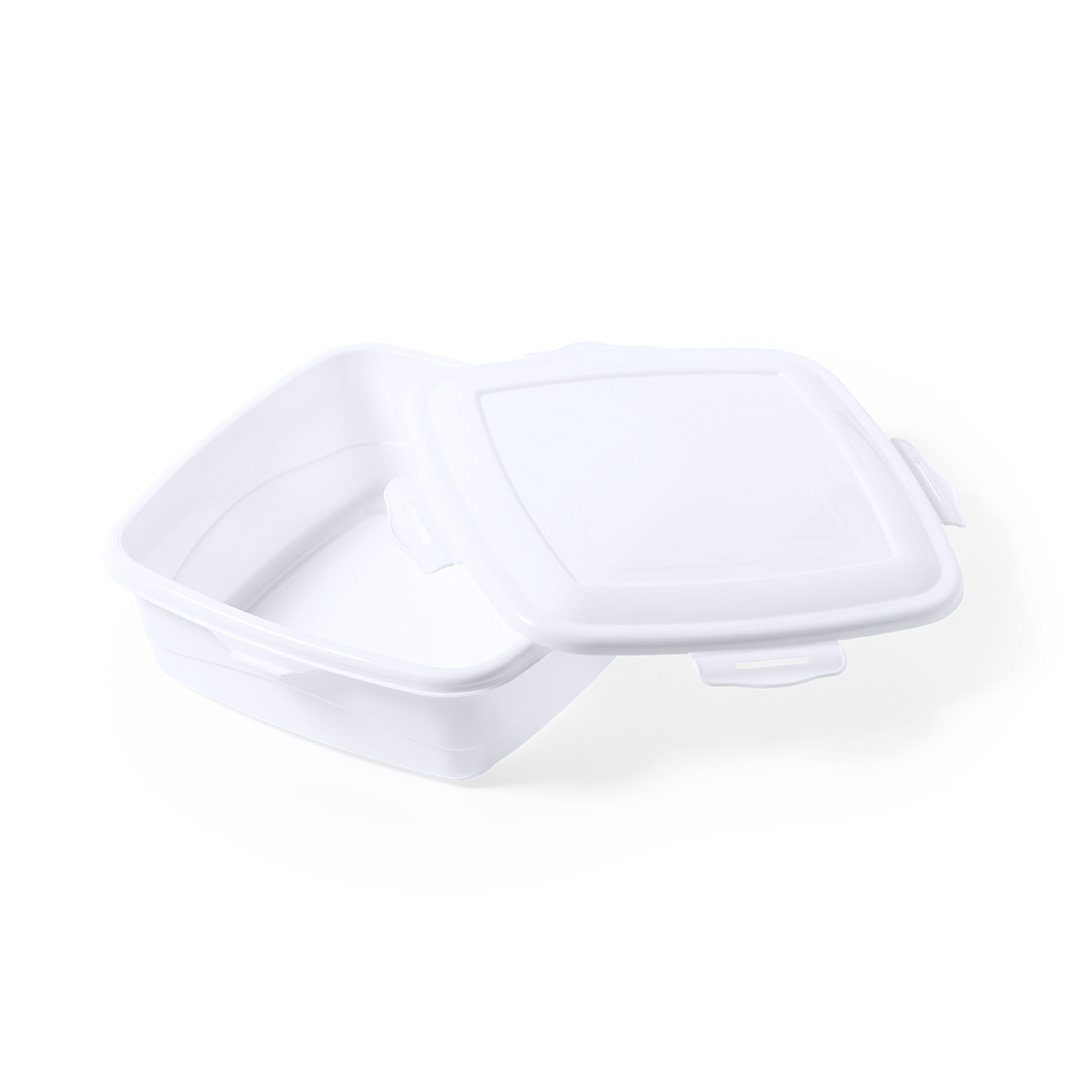 1L capacity lunch box, made of white PP. Made in Europe, with Food Grade certification, guaranteeing safety when food comes into contact with the material used to manufacture the product. Square format, with safety locks all around.