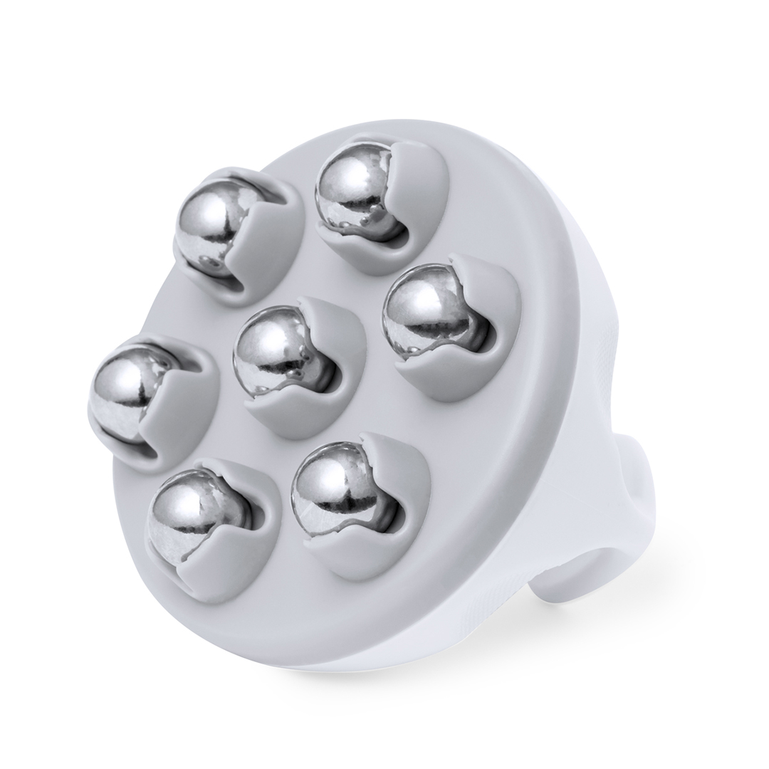 Massager made of durable ABS with metal balls. Designed to provide relief and well-being. Its ergonomic handle ensures comfortable handling, while its cold effect metallic spheres helps absorbing lotions, relaxing the tired skin. Presented in an individual kraft design box.