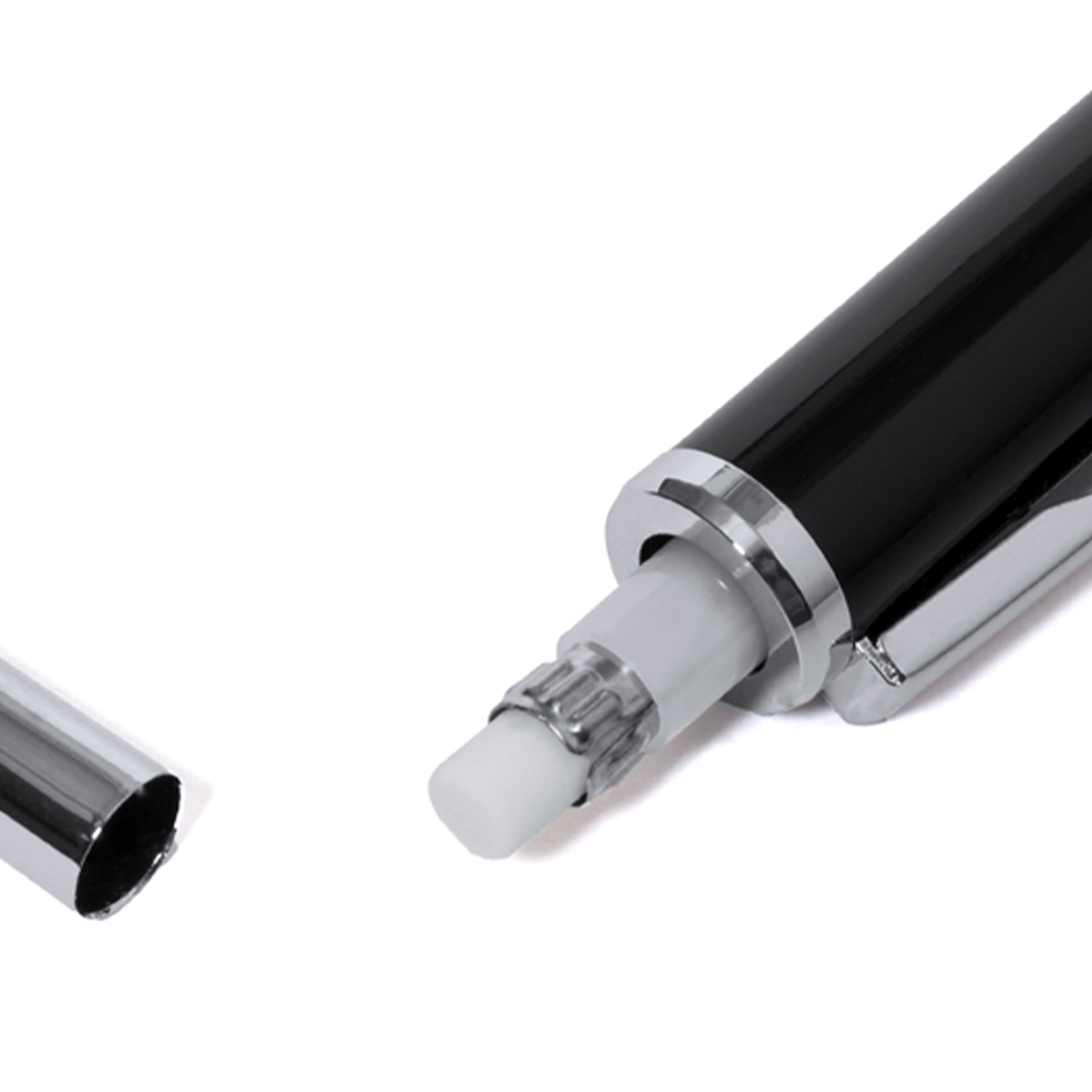 Stylish mechanical pencil made of durable ABS. Black barrel and matching smooth grip, with chrome-plated push button, clip, tip and central ring. Including eraser and 0.7 mm leads.