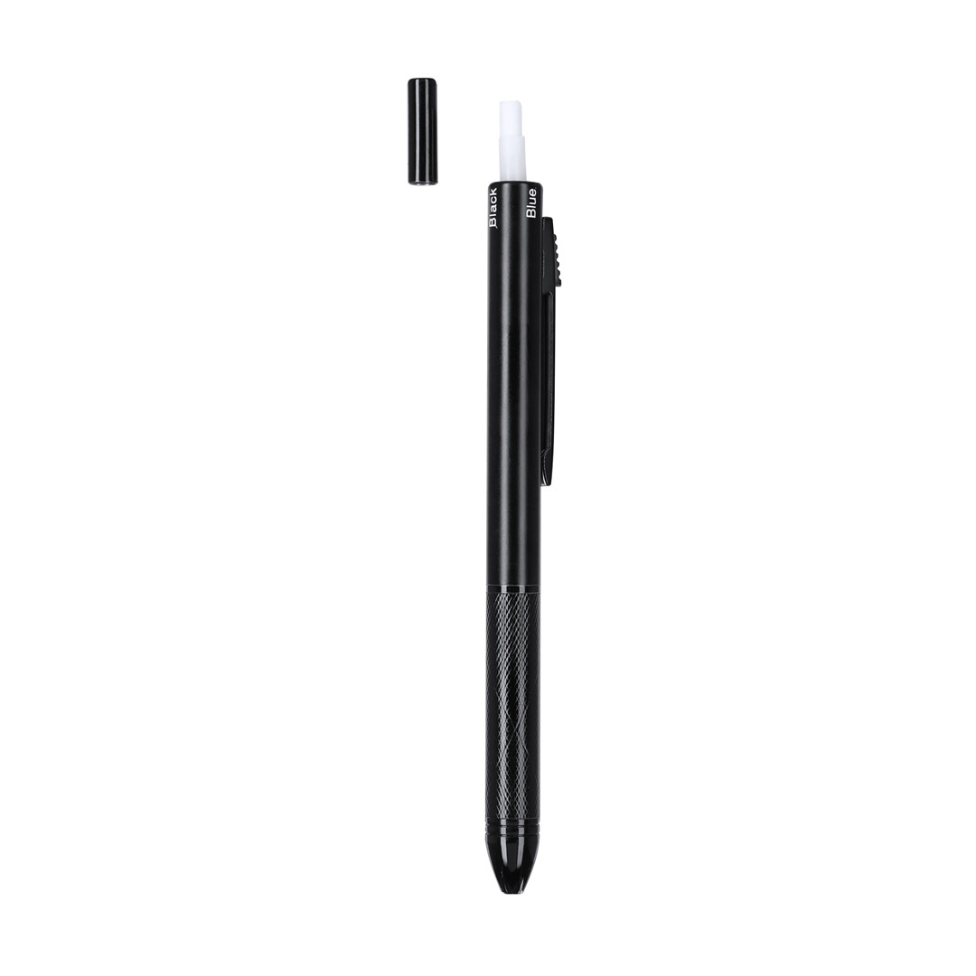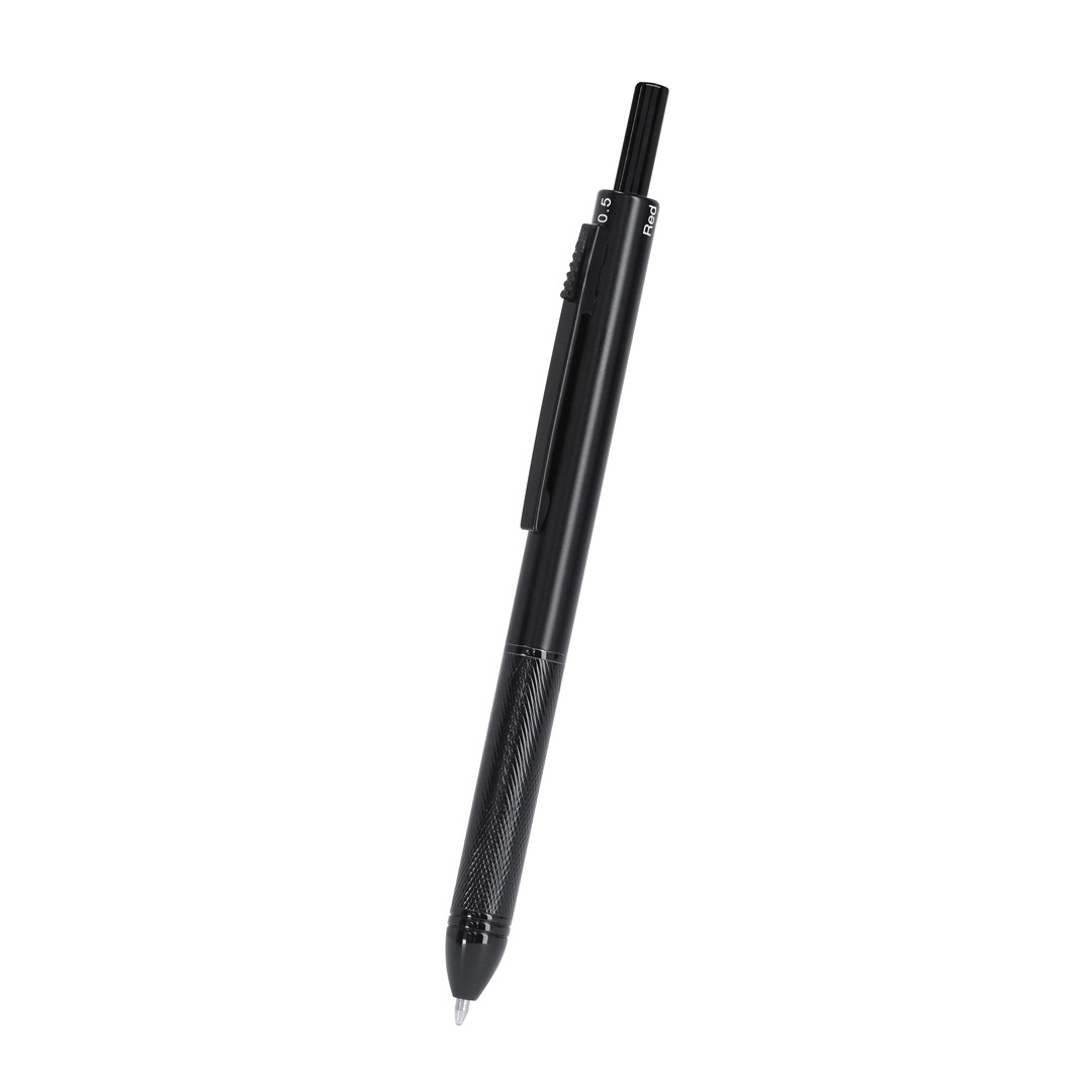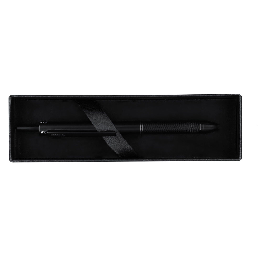 4-in-1 ball pen and mechanical pencil made in resistant aluminum, with smart mechanism allowing the selection of the colour of the ink or the pencil. Blue, black and red ink options and mechanical pencil function. Including 1 x 0.5mm lead, with integrated eraser in the push-button. Ergonomic grip and matching color clip.