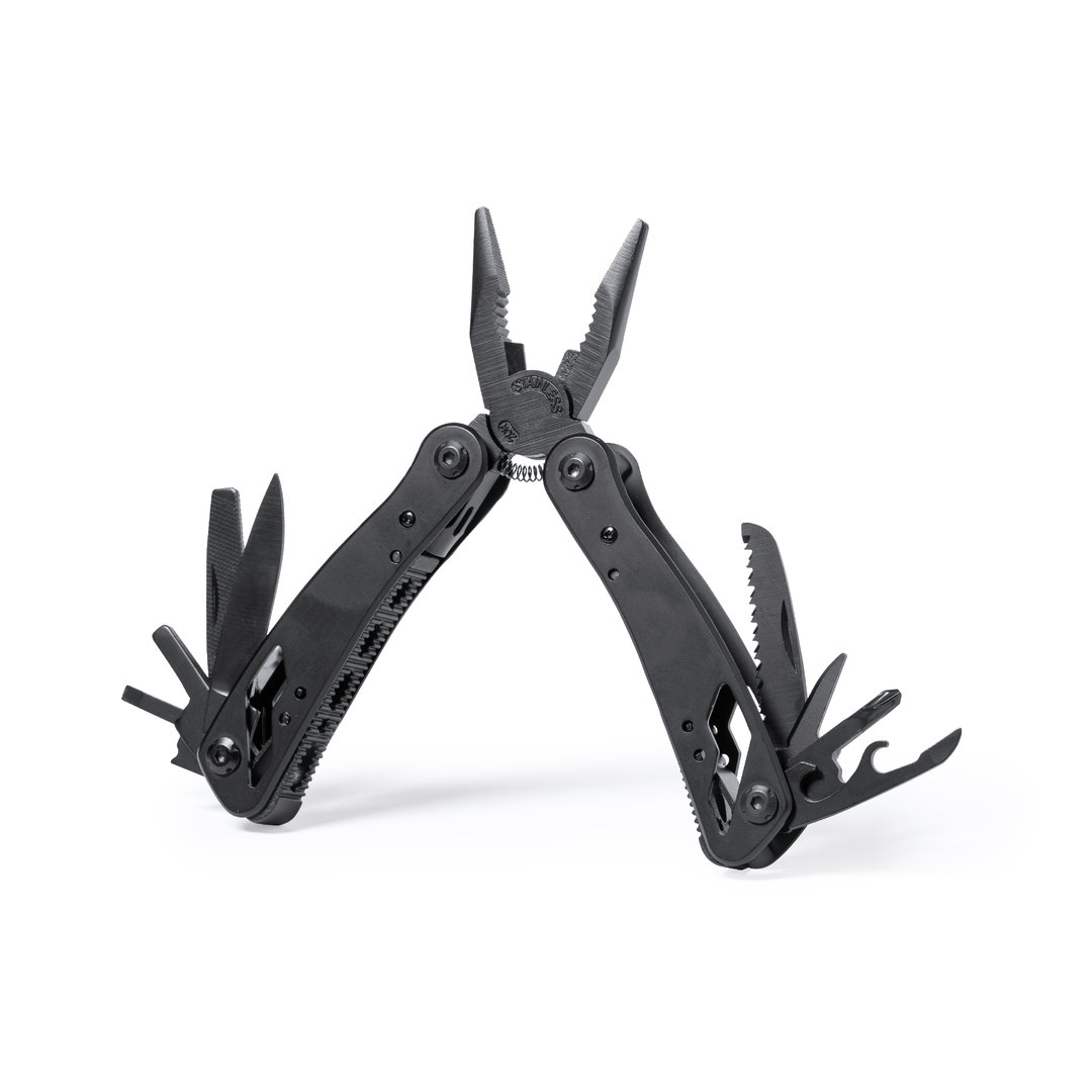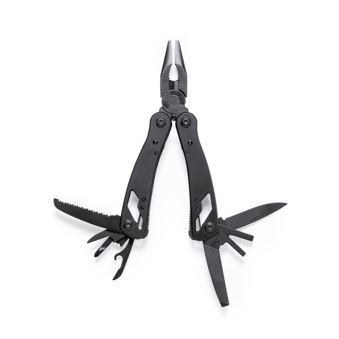 Multi-tool with accessories in stainless steel with black finish, and matching resistant aluminium handle. With 13 functions, including knife, screwdriver, file, opener, and pliers. Foldable and compact in size, presented in an individual box in black design.