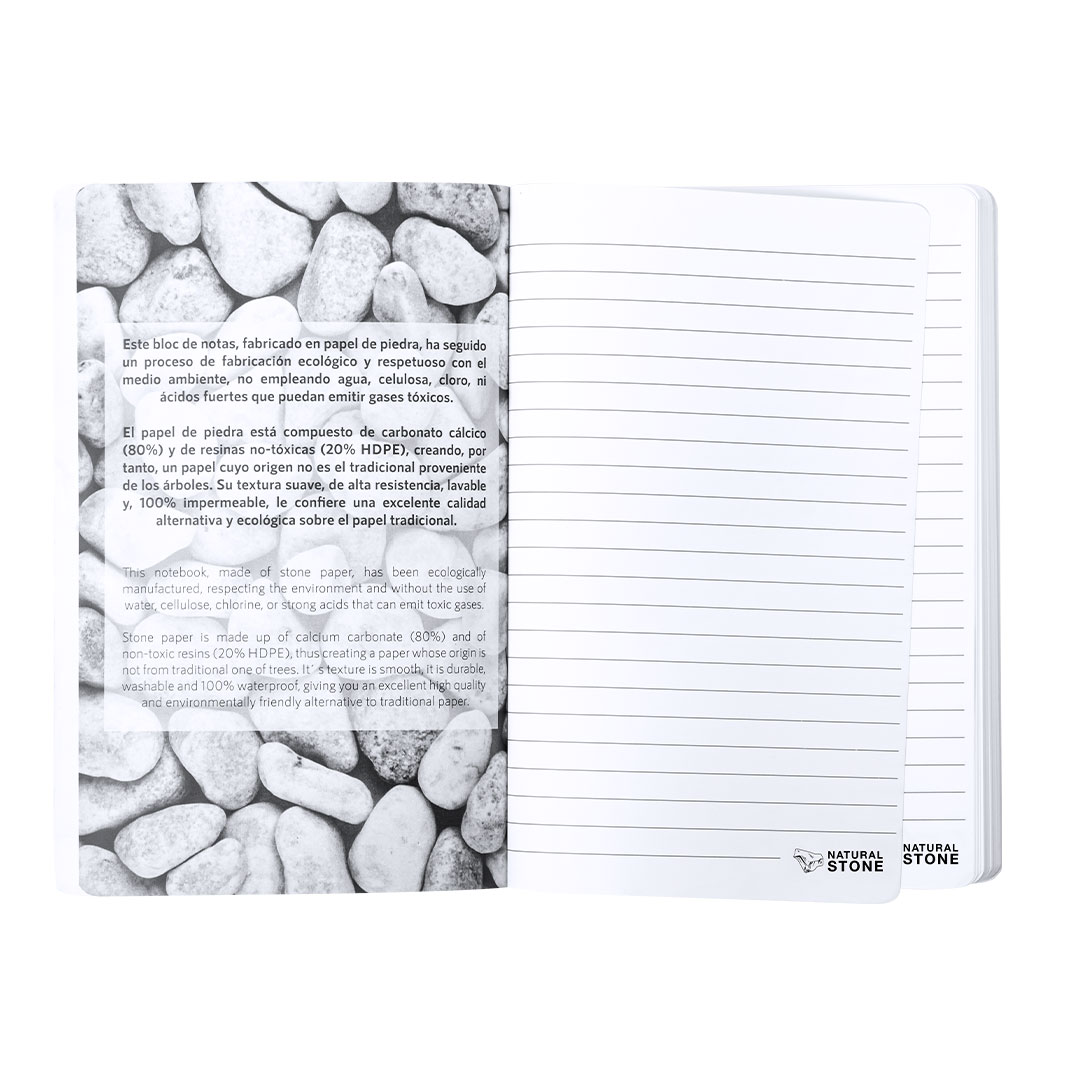 Notepad with soft cardboard covers with sheets made from stone extracts. Contains 64 white sheets and a striped layout, with an elegant white finish. Natural Stone logo on each sheet. Includes inner sheet explaining the manufacturing process from stone extracts.