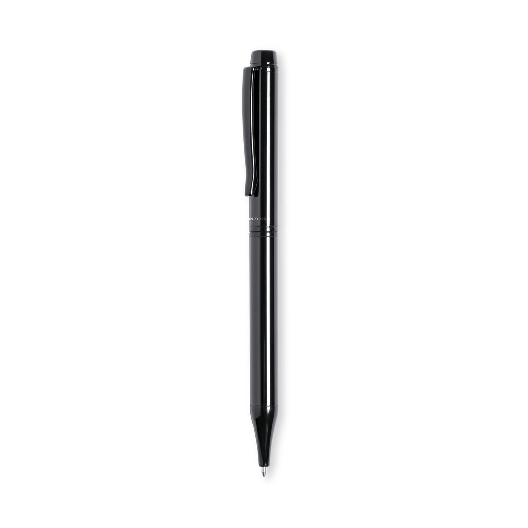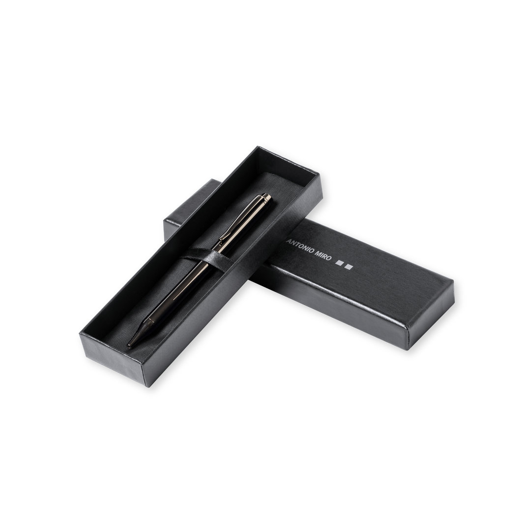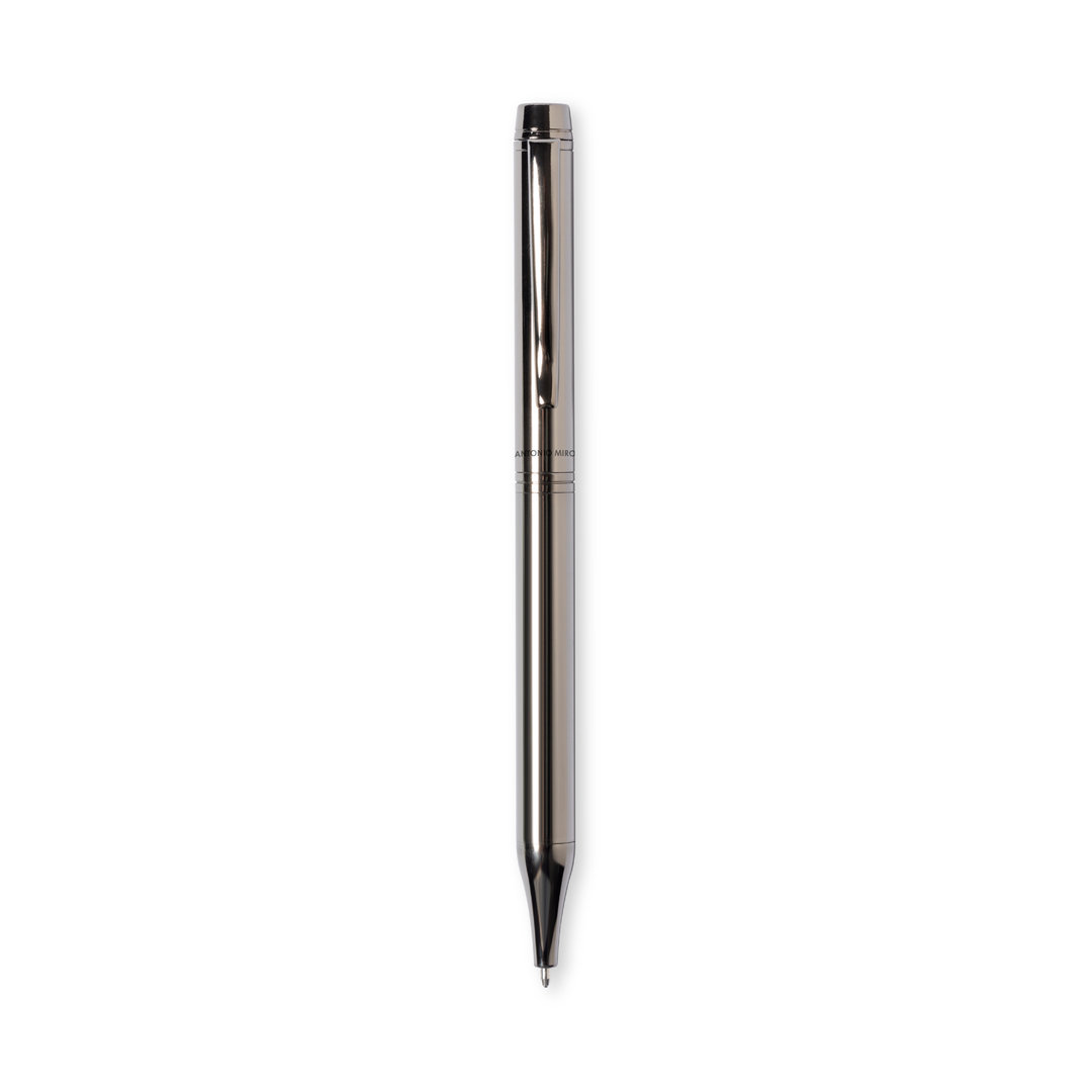 Antonio Miró ball pen made in shiny metal, with brand logo on the barrel and available in a wide range of colors. With twist mechanism and in blue ink. Presented in an elegant and resistant black individual box with Antonio Miró logo and matching sleeve.