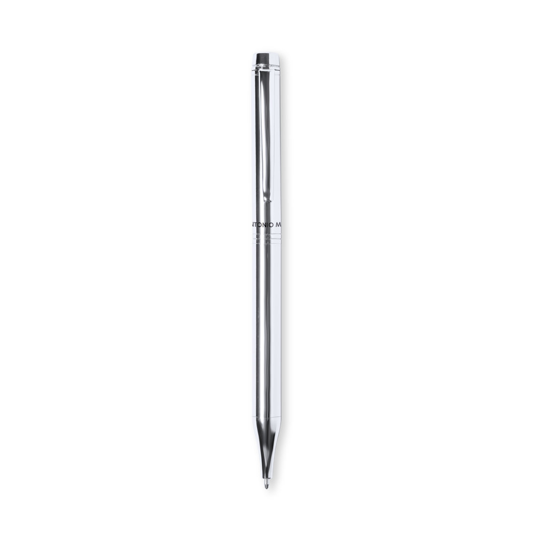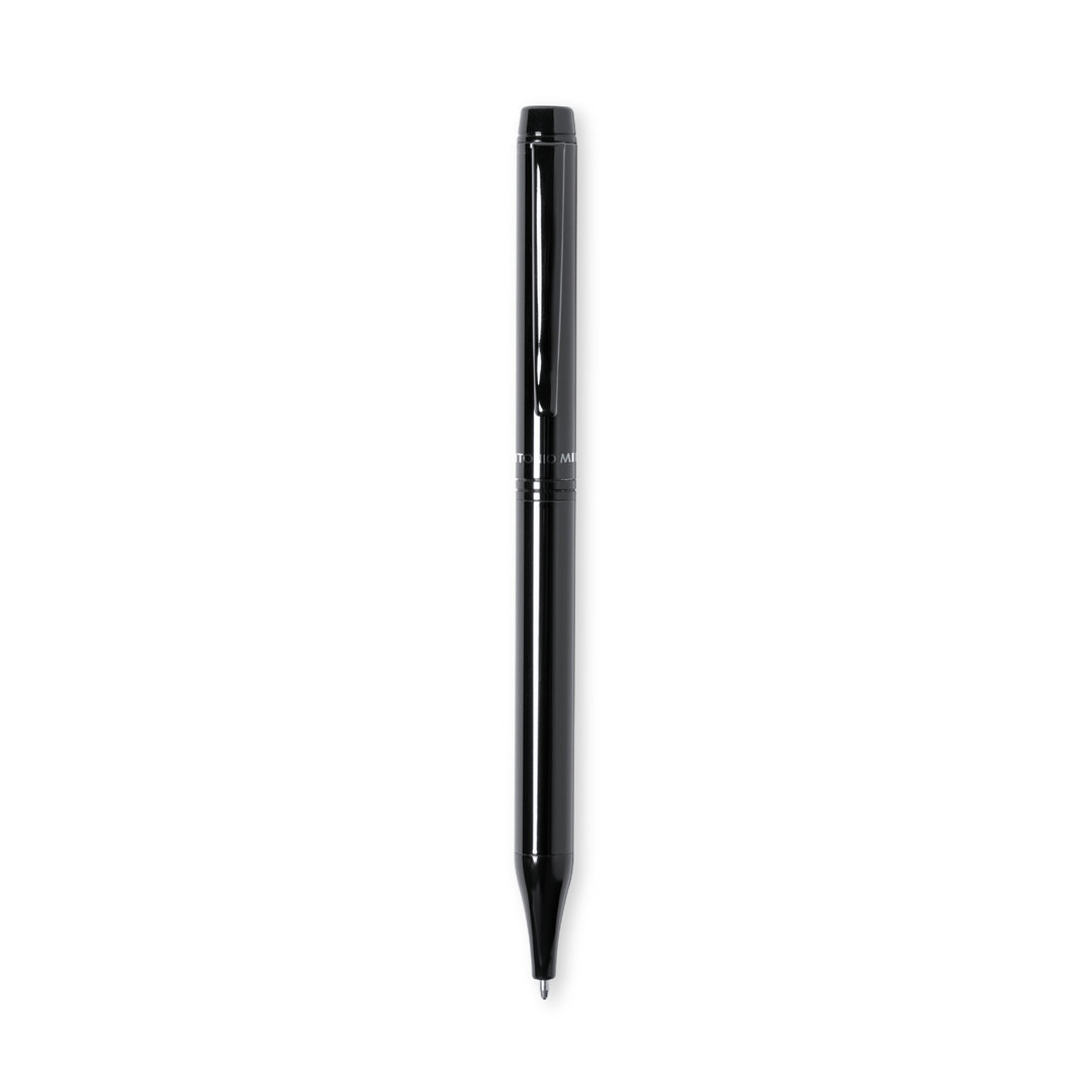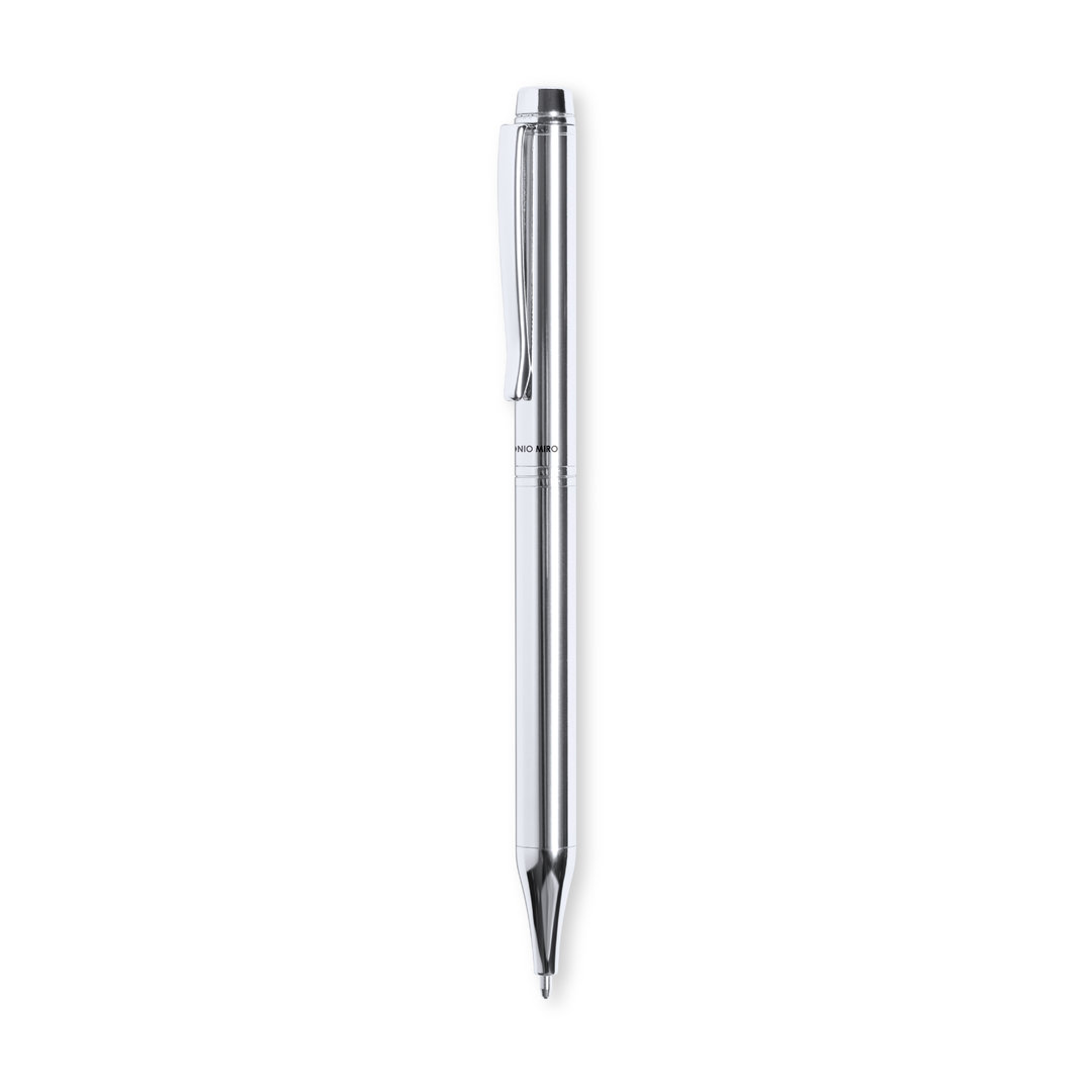 Antonio Miró ball pen made in shiny metal, with brand logo on the barrel and available in a wide range of colors. With twist mechanism and in blue ink. Presented in an elegant and resistant black individual box with Antonio Miró logo and matching sleeve.