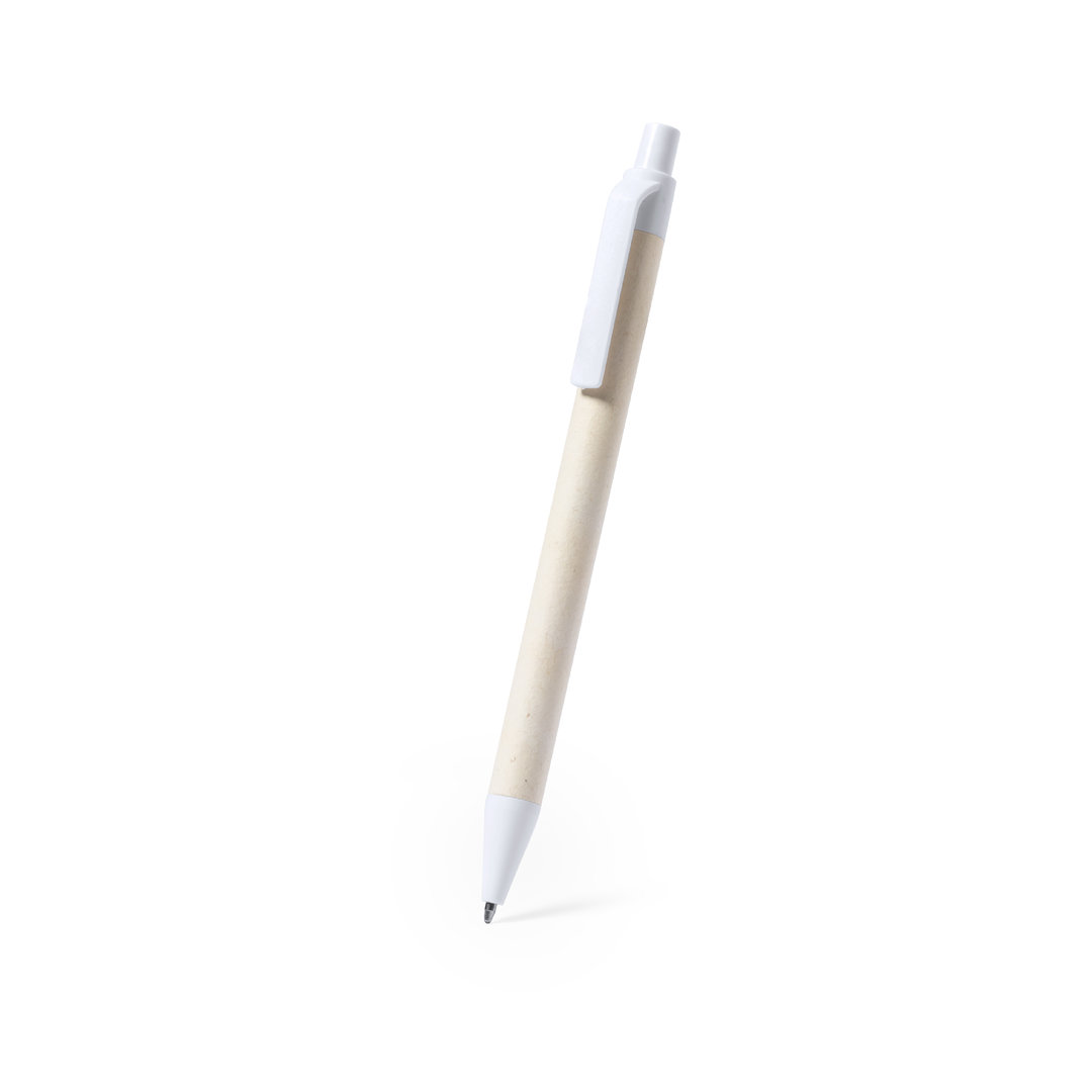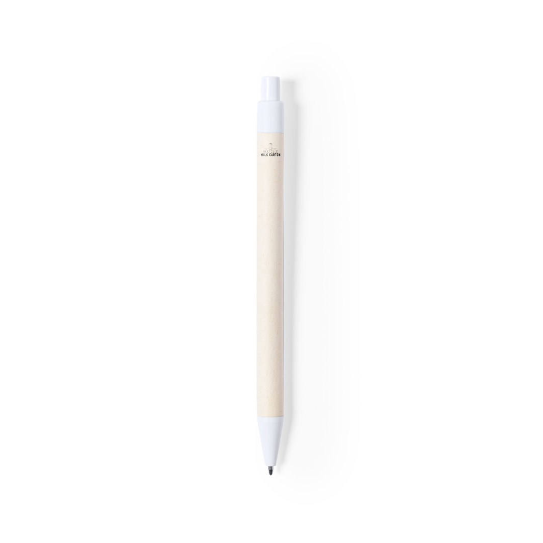 Nature line ball pen with barrel made from recycled milk cartons and white fittings. Push-button mechanism and blue ink, with the distinctive of recycled milk carton on the barrel. Milk cartons are mostly made of cardboard and aluminum. During the recycling process, the different packaging materials are separated for reuse and re-purposing, thus contributing to the infinite path of the circular economy. This material is well known for its high recyclability, as well as for its lightweight and resistance.