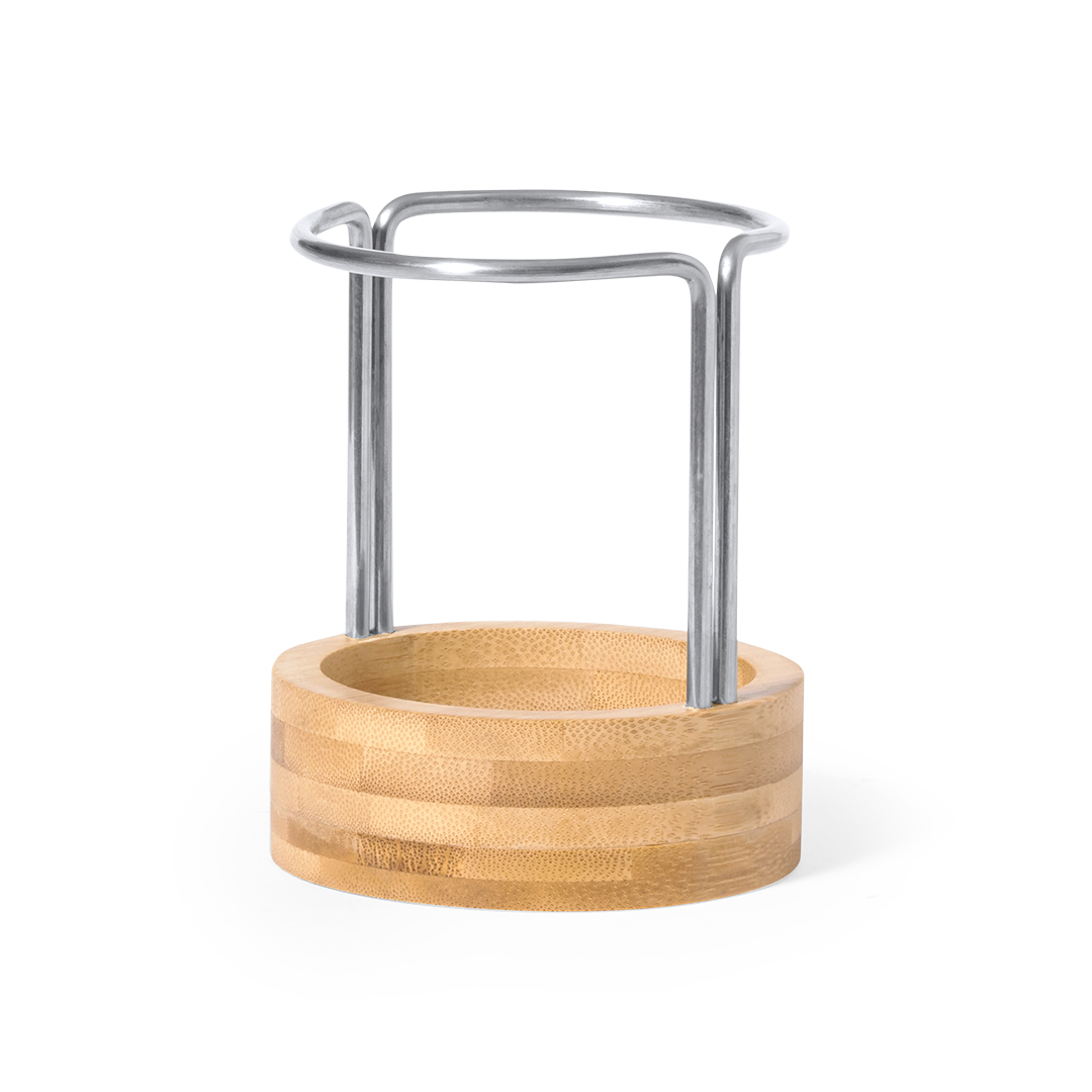 Unique design holder made in varnished bamboo and resistant stainless steel. Presented in an individual kraft design box.Materials such as bamboo encourage the use of natural raw materials and reduce pollutant emissions. In addition, bamboo comes from a highly resistant and versatile plant, with fast growth and regeneration, being an excellent alternative to the use of traditional wood.