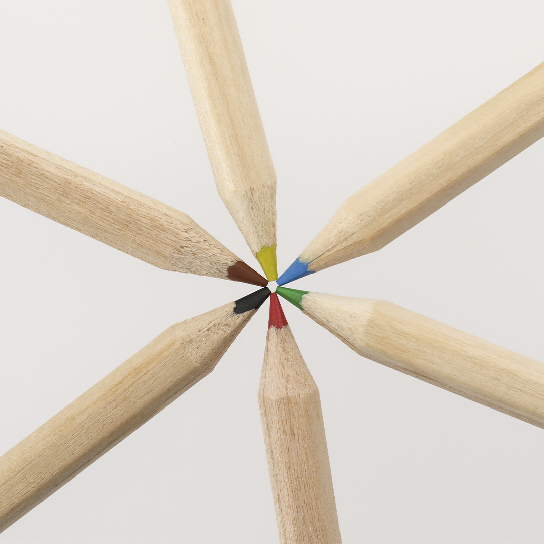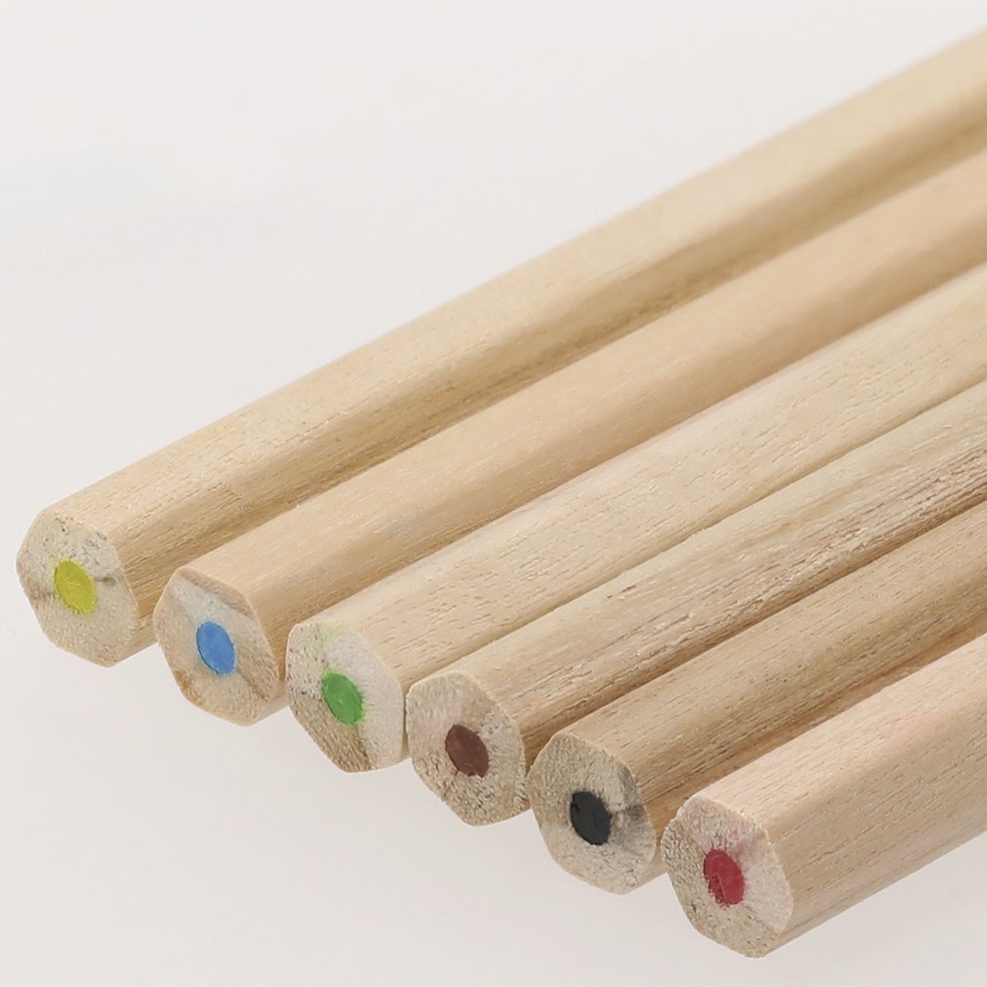 Set of 6 wooden pencils, with hexagonal body and leads in various colors. Presented in a white cardboard case with flap closure. Special for digital printing.