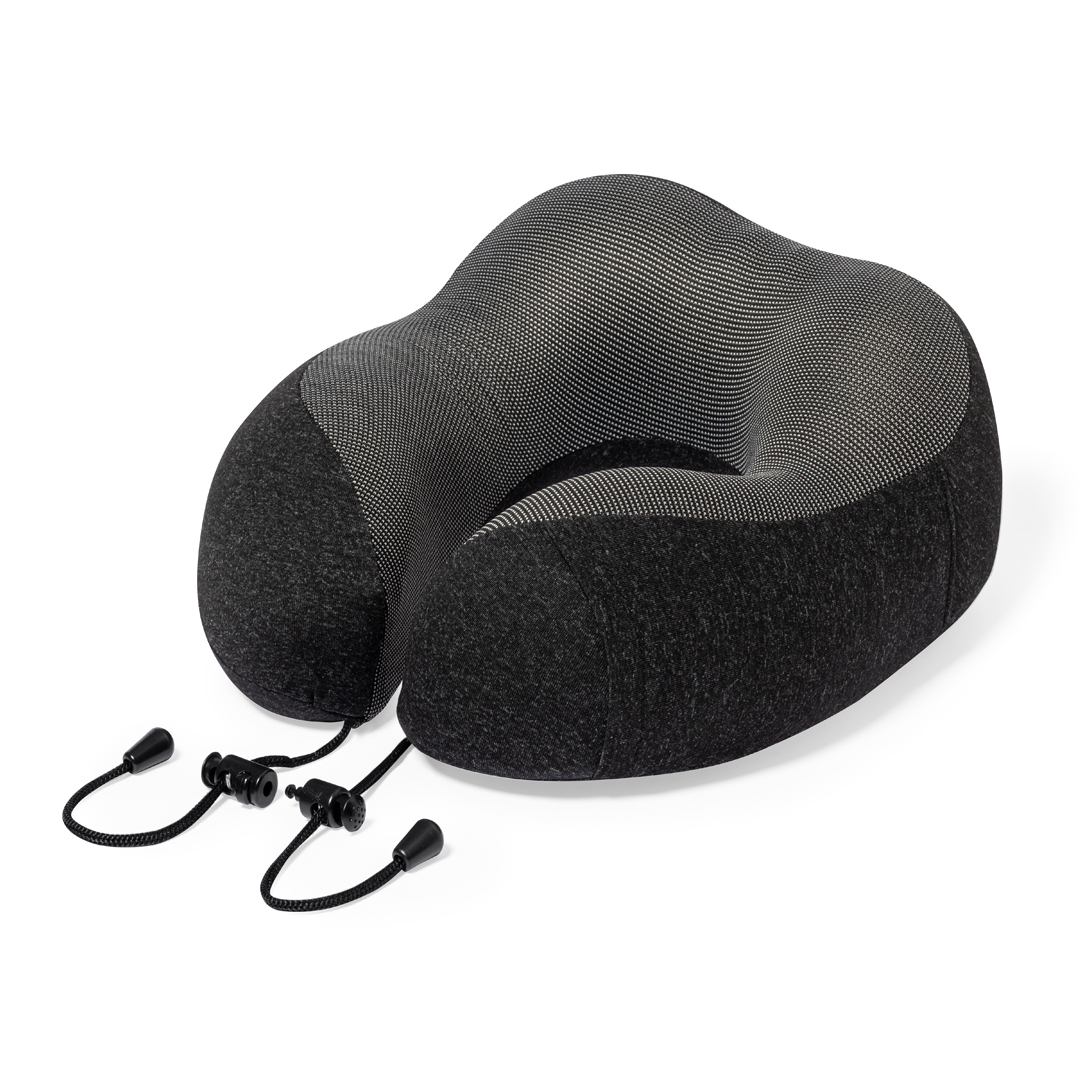 Comfortable and padded portable neck pad. Ultimate comfort experience for any journey due to the soft touch padding and drawstring fasteners for a correct and comfortable fit. With RPET pouch for protection during transport and label.RPET material is made from recycled plastic, thus promoting the reuse of plastic waste and helping the sustainability of the planet.