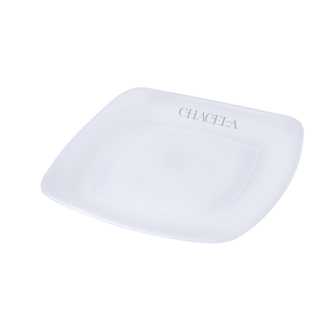 Flat dish made of strong and flexible PP material. Square shape, reusable and in translucent finish.