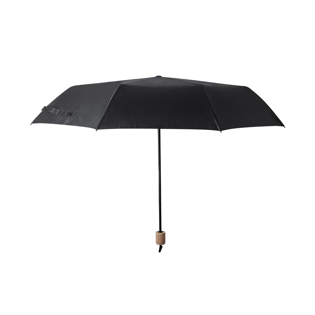 Stylish premium set. Including: Recycled Stainless Steel thermos tumbler with double wall and 550 ml capacity, in elegant matte black finish. Cork base, with push-on lid and dispenser. It is ideal for your desk, table, or any surface where you can enjoy your favorite drink. Foldable black umbrella with 98cm diameter. In 190T RPET pongee material and with cork handle. Manual opening, with windproof mechanism and fibre glass ribs. With distinctive RPET label. Set presented in an individual matte-finish case, with inner die-cutting for each of the elements of the set. The RPET material is made from recycled plastic, promoting the reuse of plastic waste and helping the sustainability of the planet.
