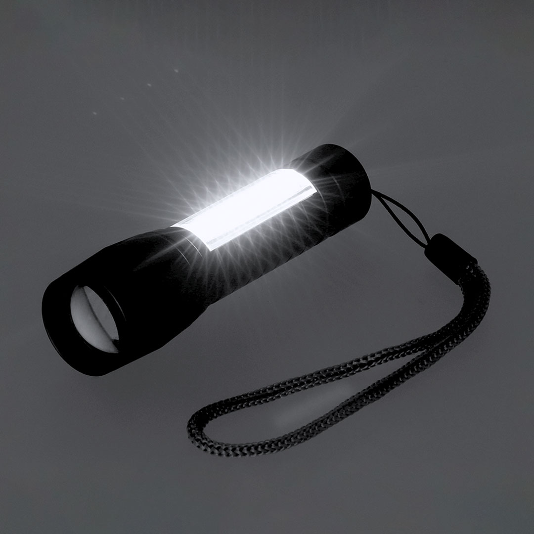 Powerful flashlight with rechargeable battery, made of matte finish aluminum. Front light with 8 LEDs and adjustable zoom. In addition, it has 10 COB lights on the handle and three lighting modes (fixed and flashing and side), includes transport belt. It is powered by a 400 mAh rechargeable battery, including Type-C cable.