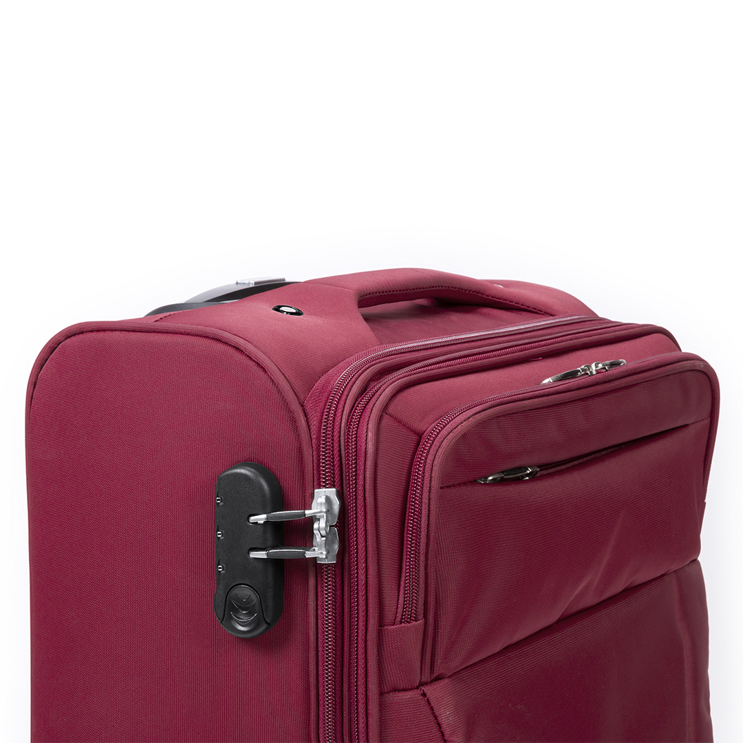Full opening business trolley with 4 telescopic wheels in nylon. Sober in color, with matching color reinforced external handle and practical front pockets. With name tag, numeric combination security lock and matching color zippers, including an inside padded compartment for laptops up to 15 inches and a wide range pockets.